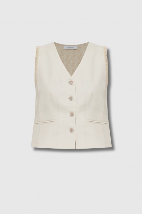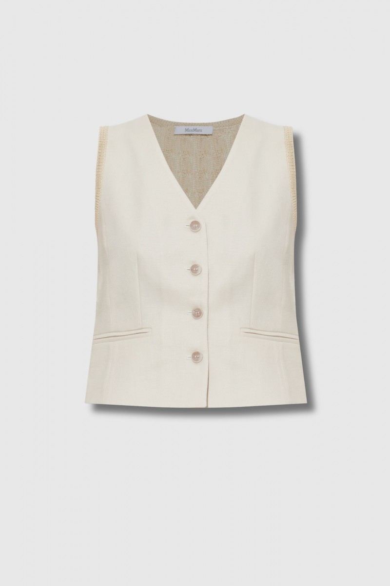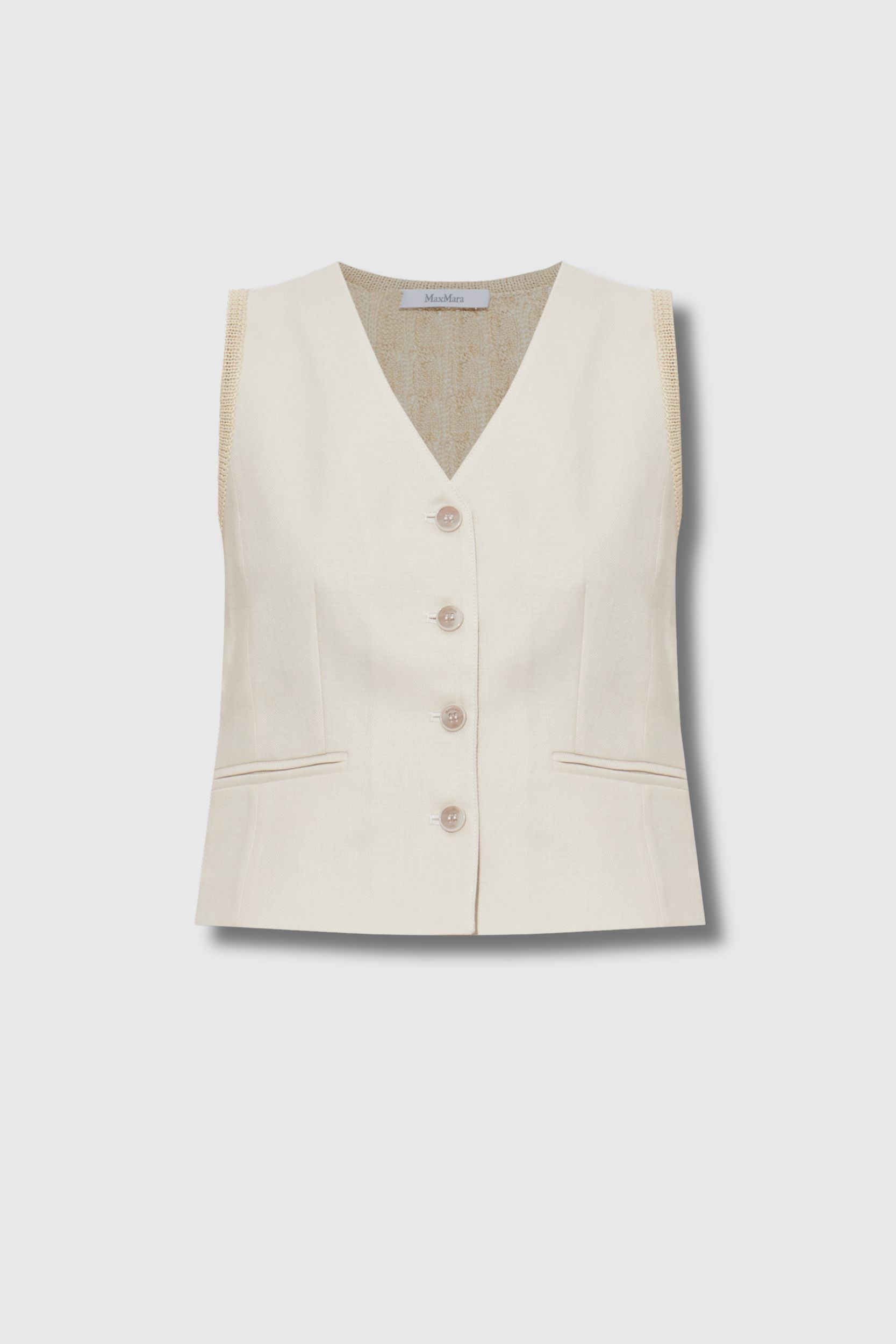 Ce top Calibri sans manches boutonné beige est signé Max Mara. Élégant et structuré, il présente un devant lisse au design minimaliste qui souligne la silhouette. Confectionné dans un mélange de lin, acétate et polyester, il se distingue par un dos en maille ajourée apportant légèreté et modernité. Le modèle est complété par quatre boutons nacrés, deux rabats décoratifs façon poches et une ceinture au dos qui marque subtilement la taille.