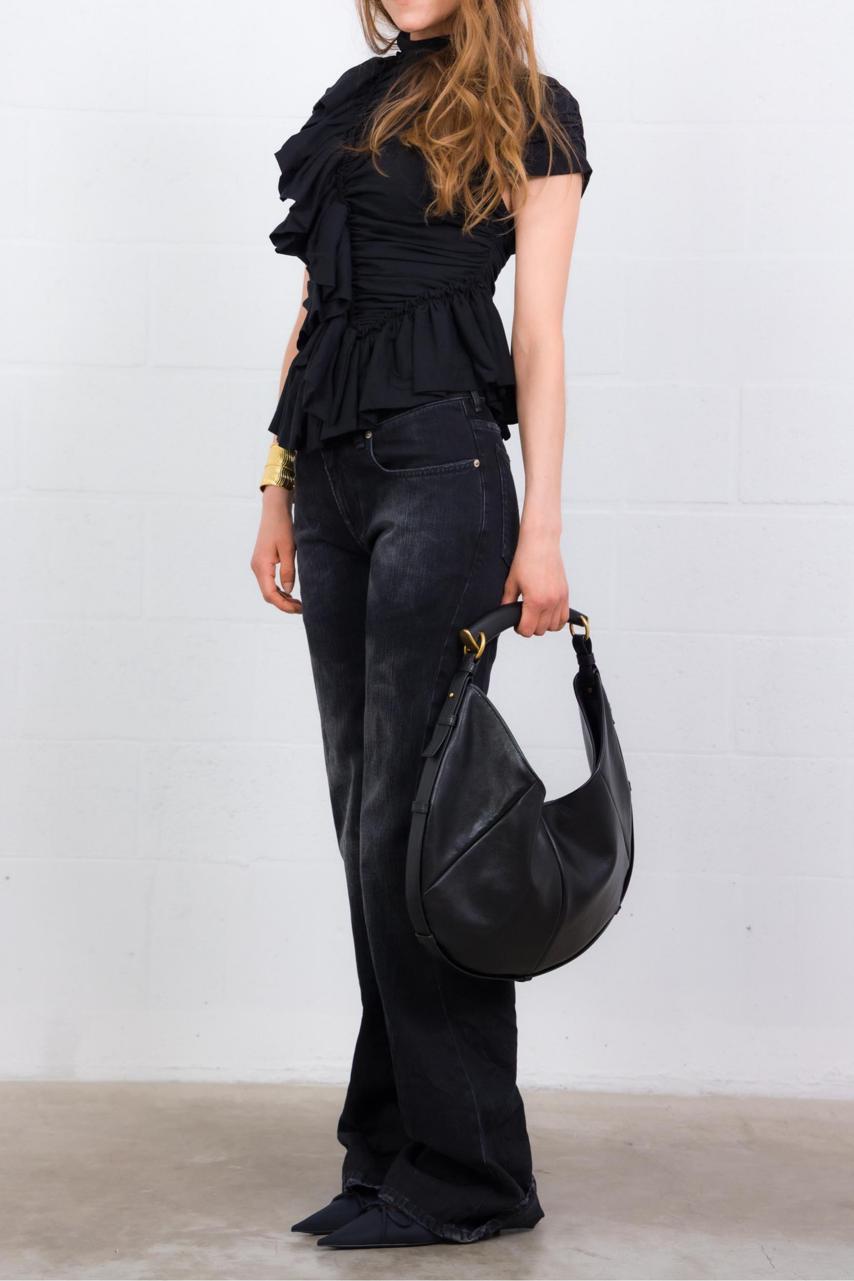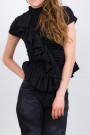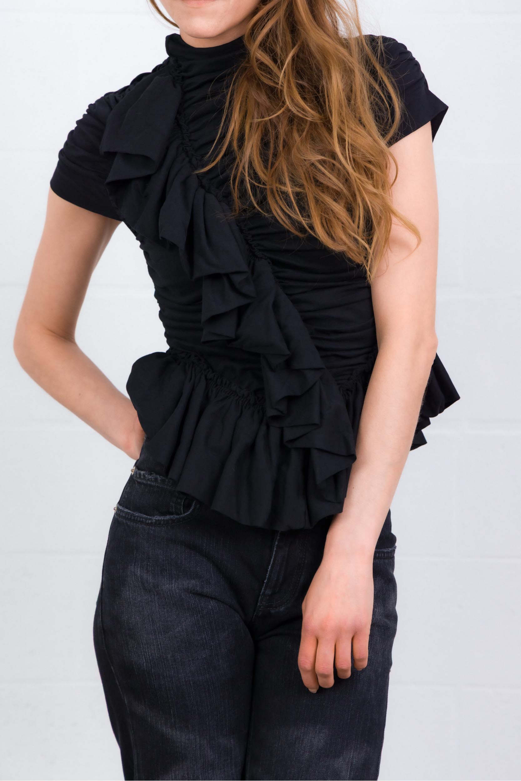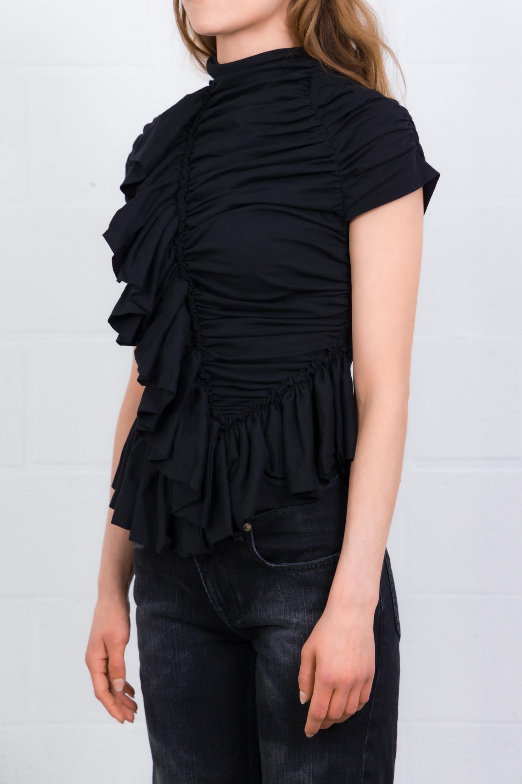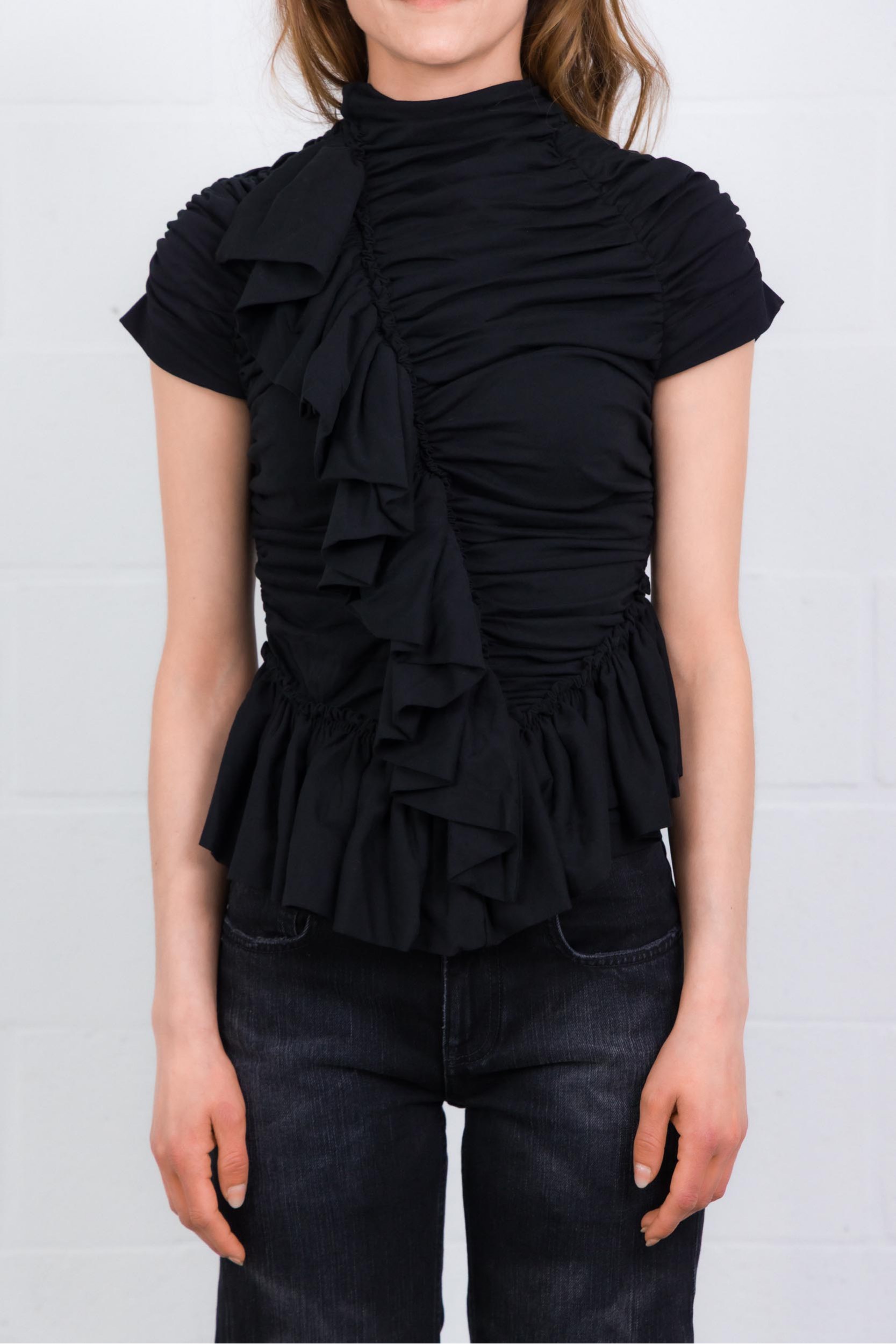 Ce top Ruffle noir est signé Dries Van Noten. Confectionné en jersey de coton léger, il présente une coupe ajustée avec un col montant froncé et des volants délicats, apportant une touche féminine et élégante.