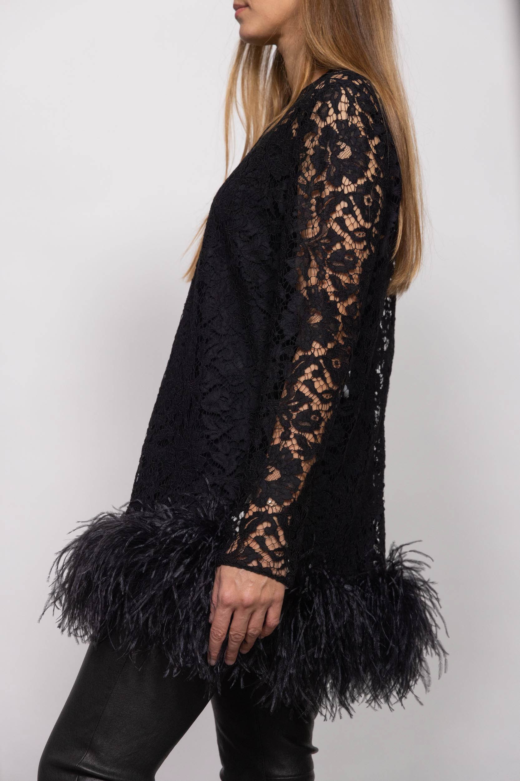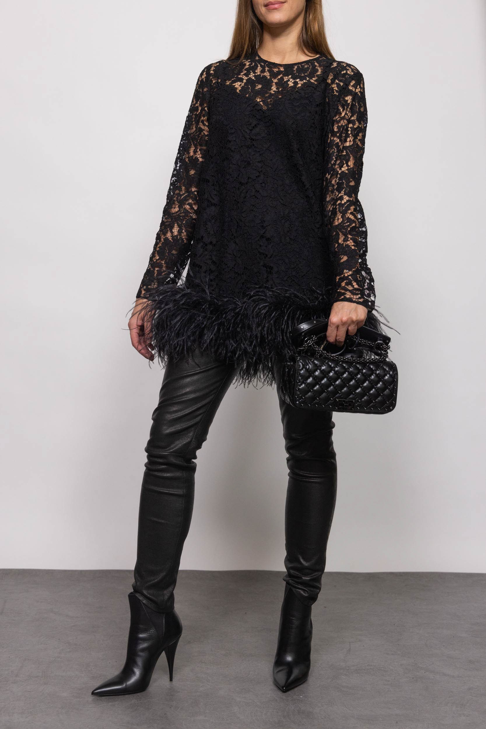 Ce top Valentino est confectionné en Italie à partir de guipure à motif floral et présente une coupe longue et décontractée. Il s’accompagne d’une doublure en soie ton sur ton pour plus de confort et s’achève sur un ourlet bordé de plumes d’autruche pour une allure glamour.