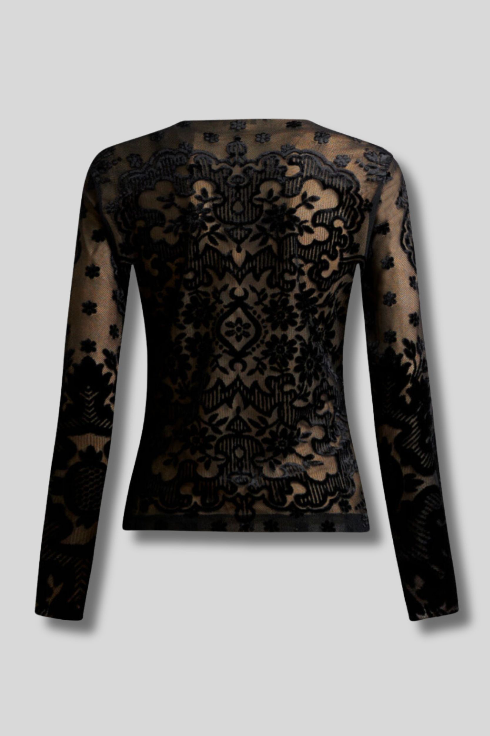 Ce top en velours jacquard noir est signé Etro. Celui-ci est confectionné dans un tissu stretch et permet un effet de transparence. Cette pièce présente une encolure ronde et des manches longues.