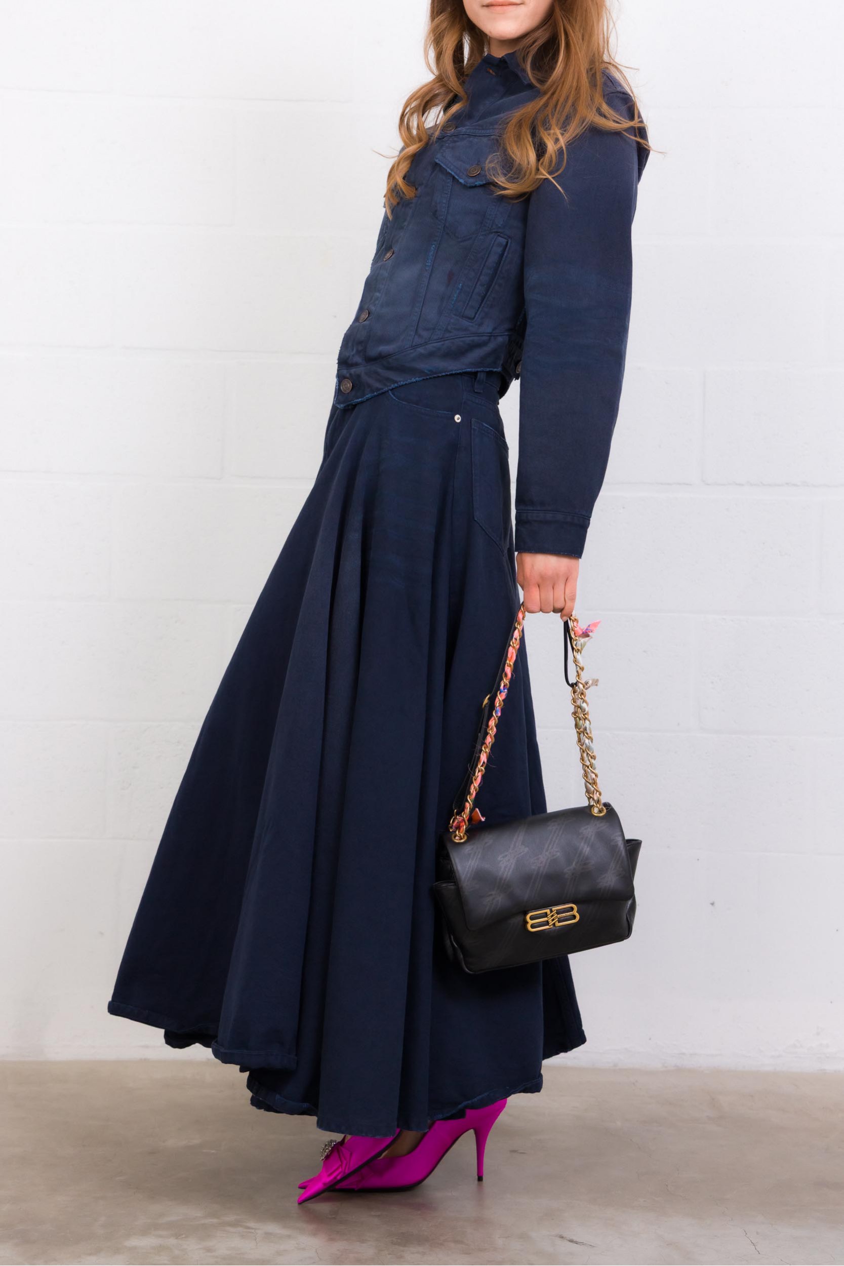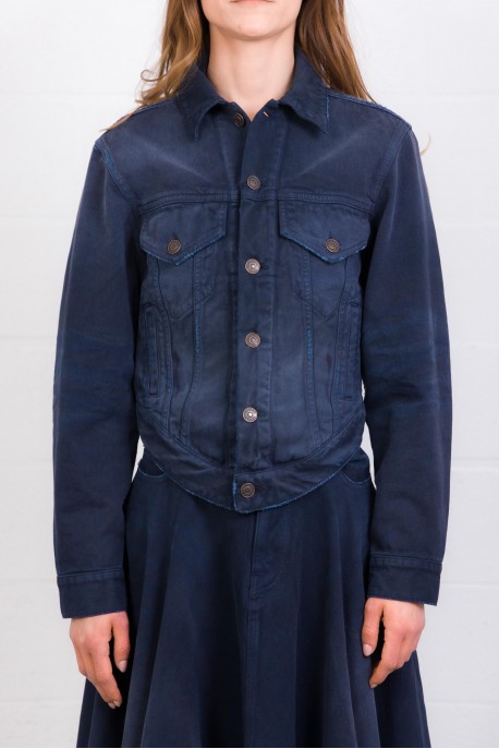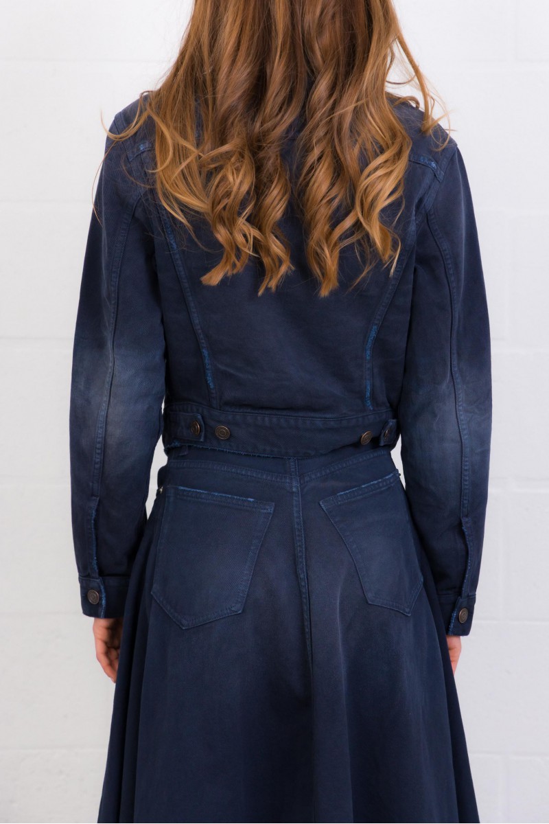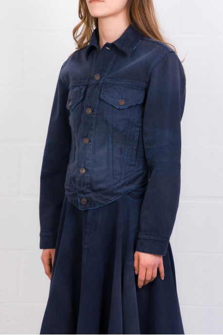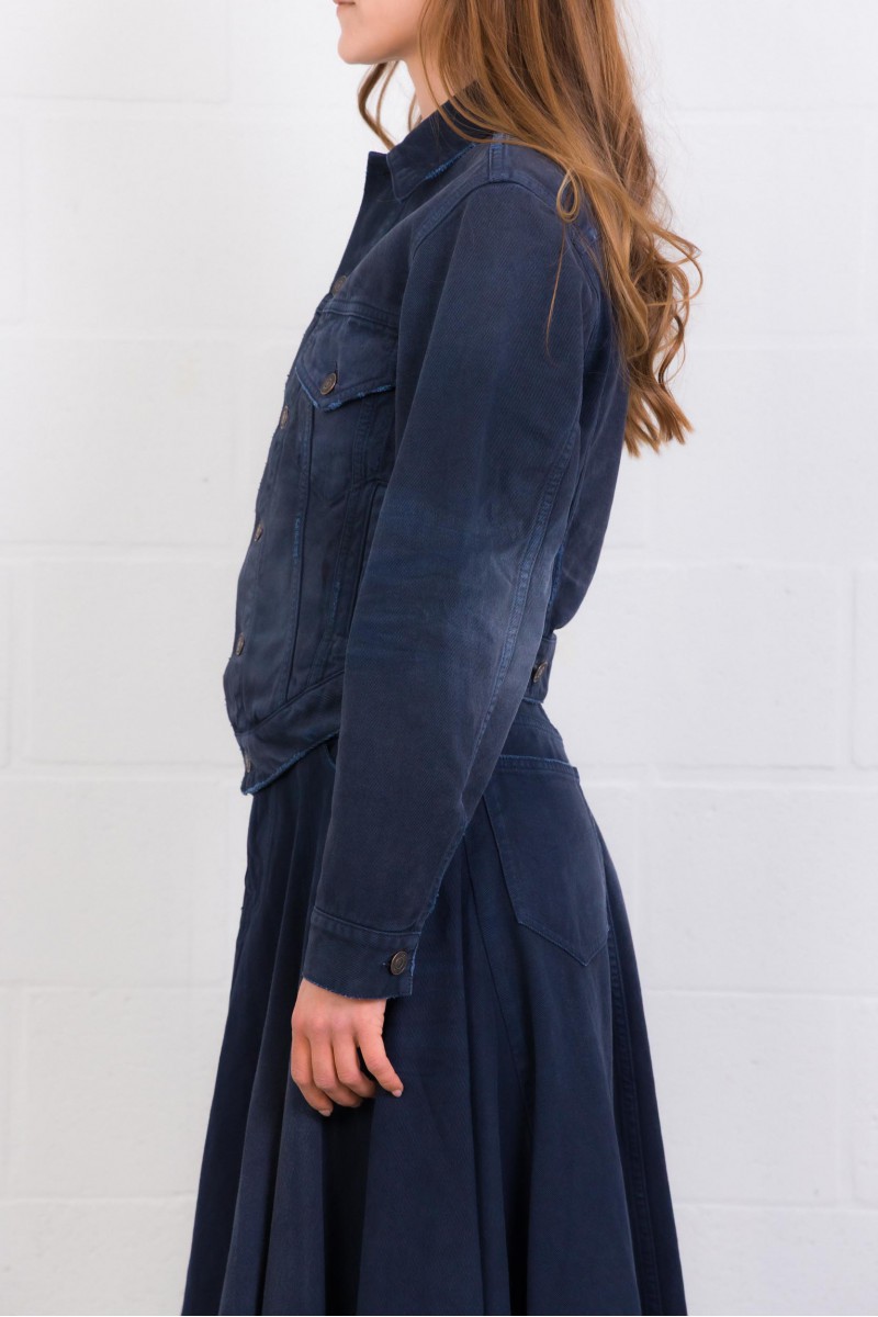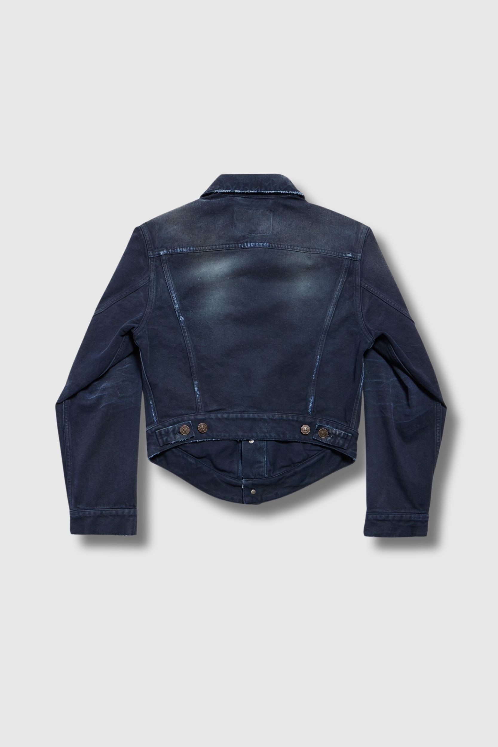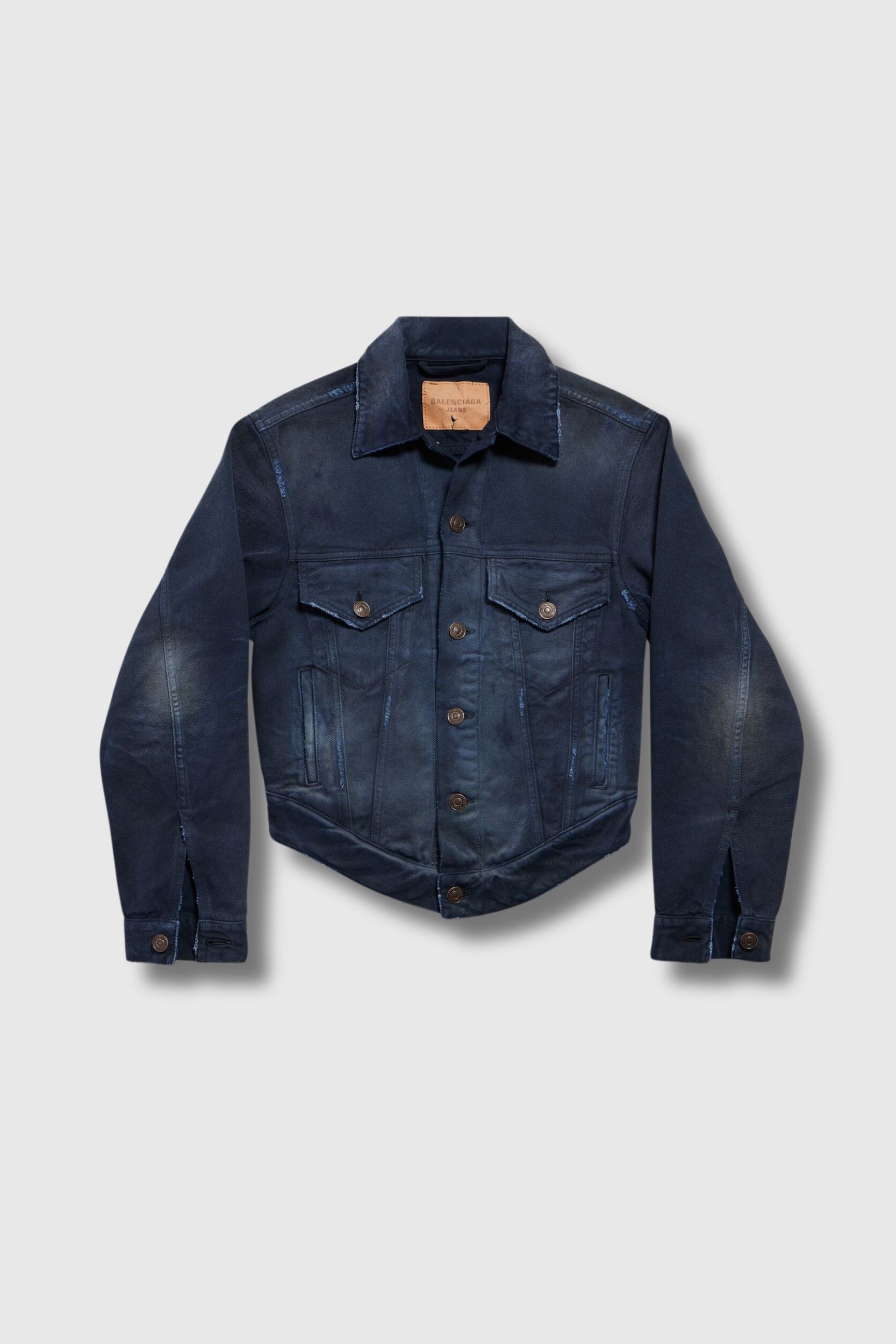 Cette veste en denim bleu marine signée Balenciaga, confectionnée en denim de coton à l’effet usé et délavé. Elle présente une fermeture à six boutons à l’avant, deux poches poitrine à rabat boutonné, deux poches fendues, ainsi que des poignets boutonnés. La taille est ajustable grâce à une patte de boutonnage, tandis que les boutons Flex gravés Balenciaga apportent une finition distinctive. Bas arrondi.