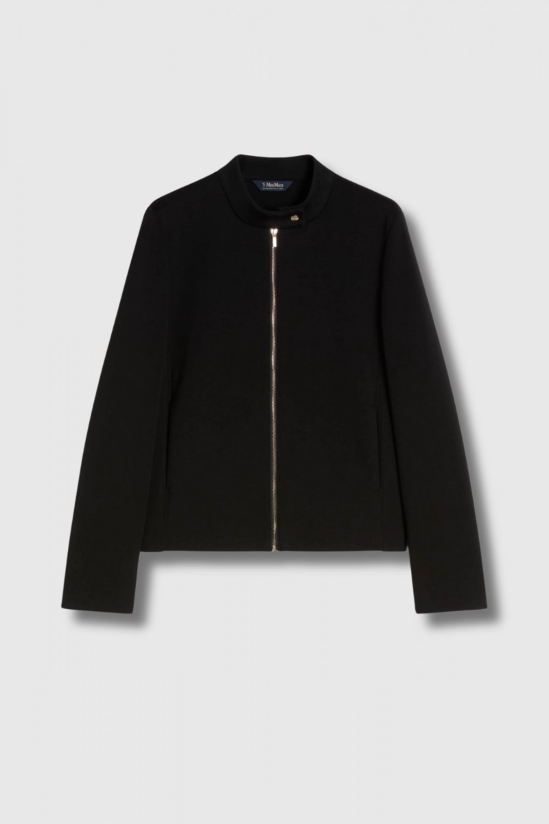 Cette veste Casta courte noire est signée Max Mara. Confectionnée en jersey scuba de coton mélangé, elle présente une coupe courte moderne. Dotée d’un col montant avec bouton-pression, de manches longues avec détails pression au bas et d’une fermeture zippée en métal, elle allie technicité et élégance. Les poches latérales et l’empiècement au dos complètent ce modèle non doublé.