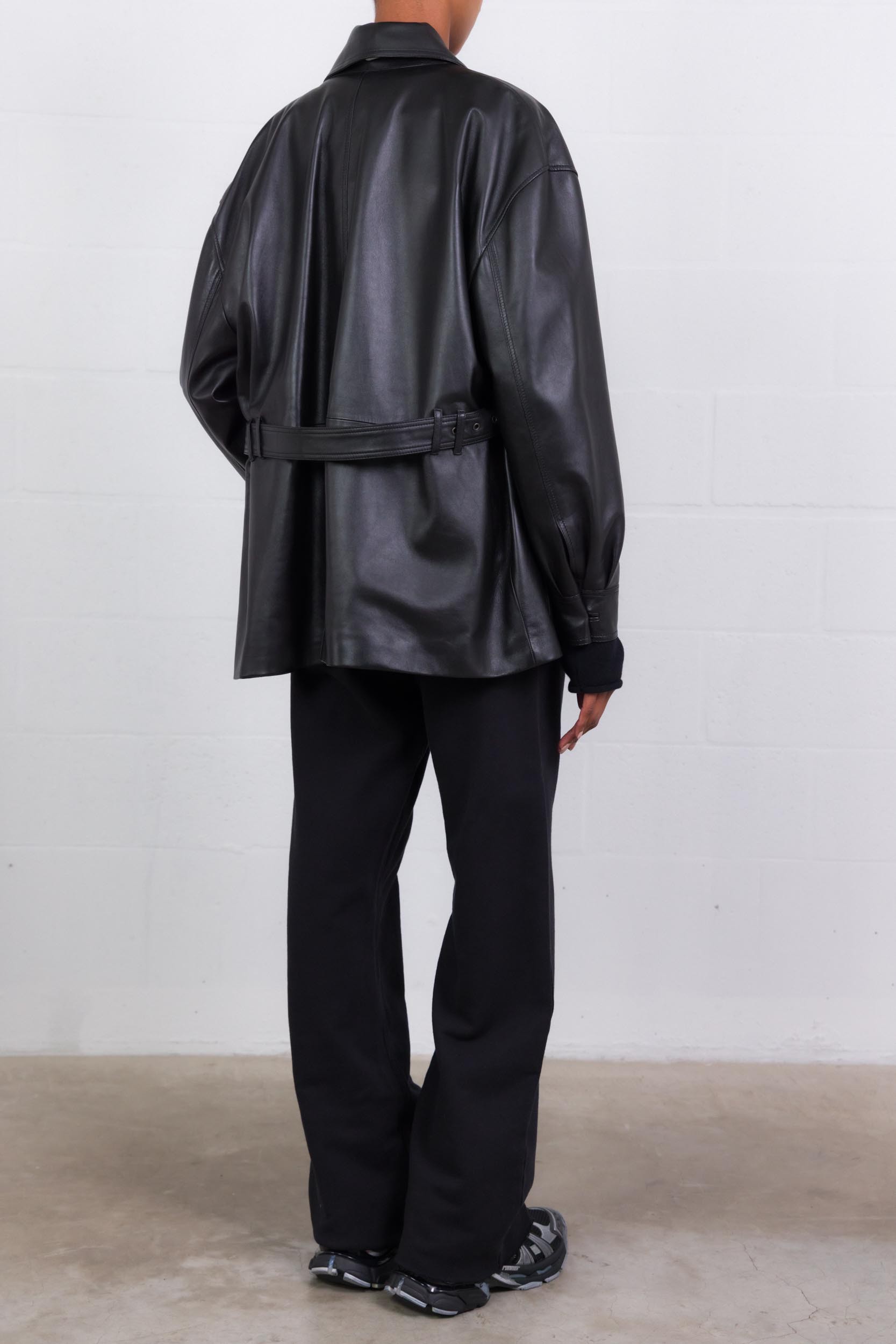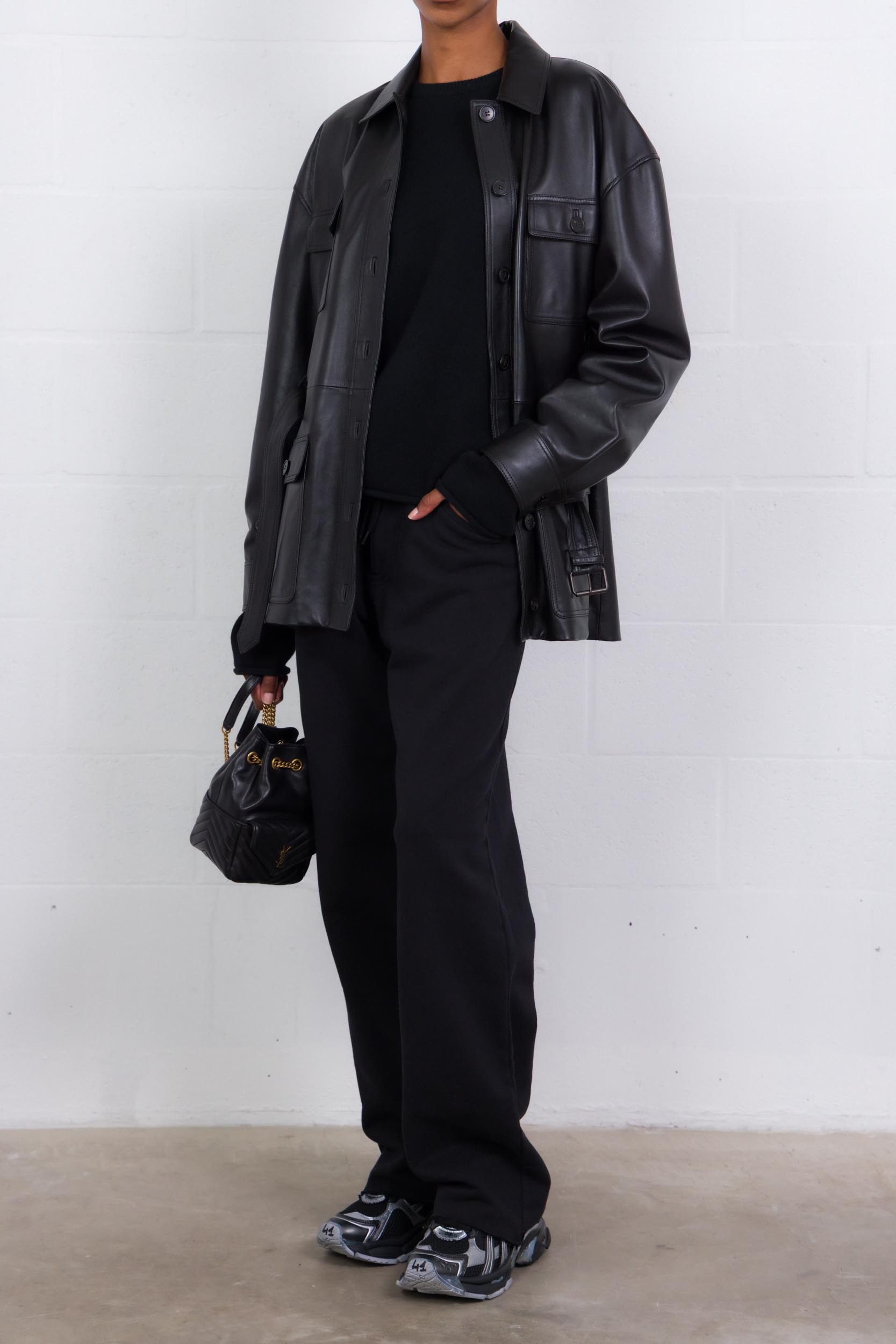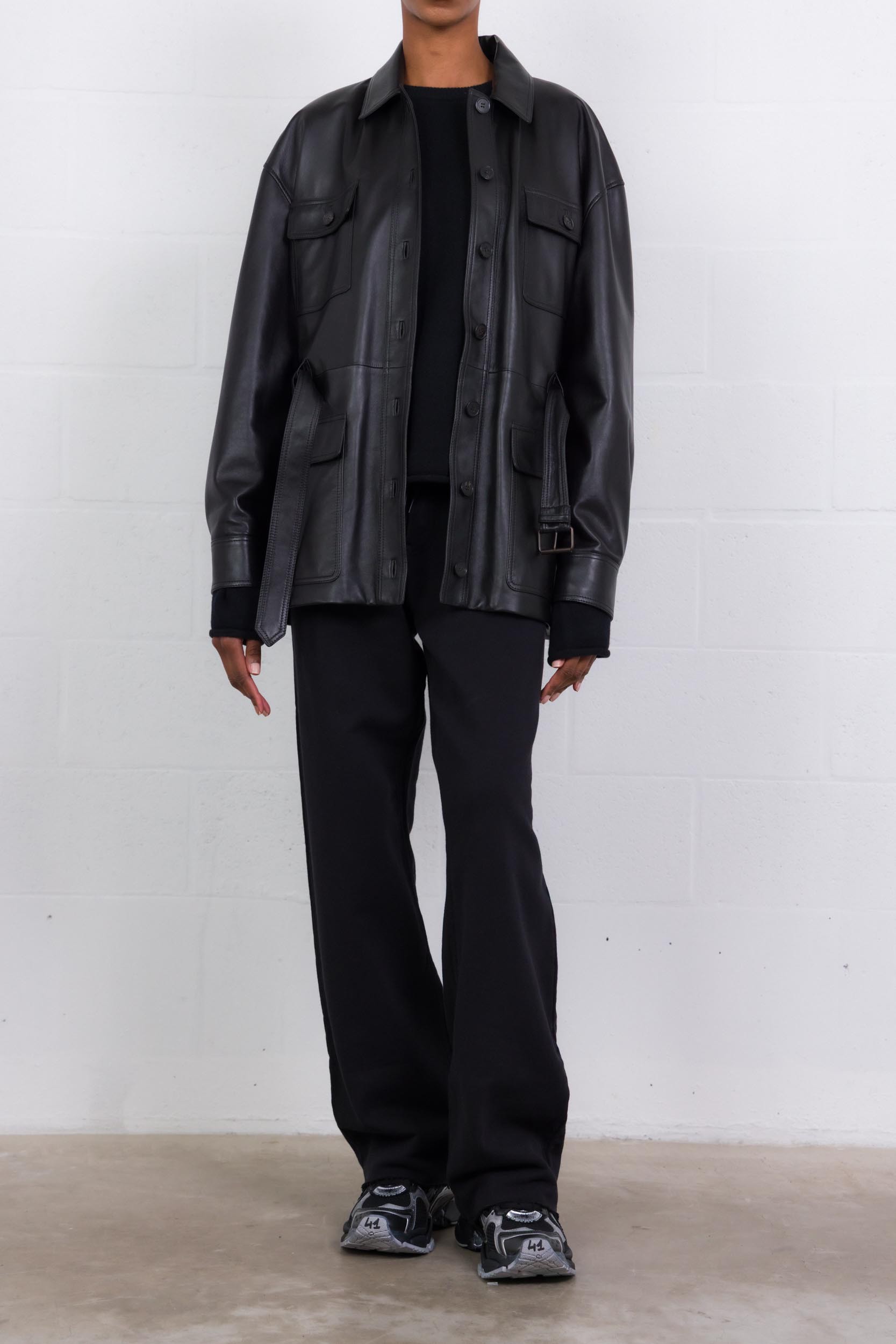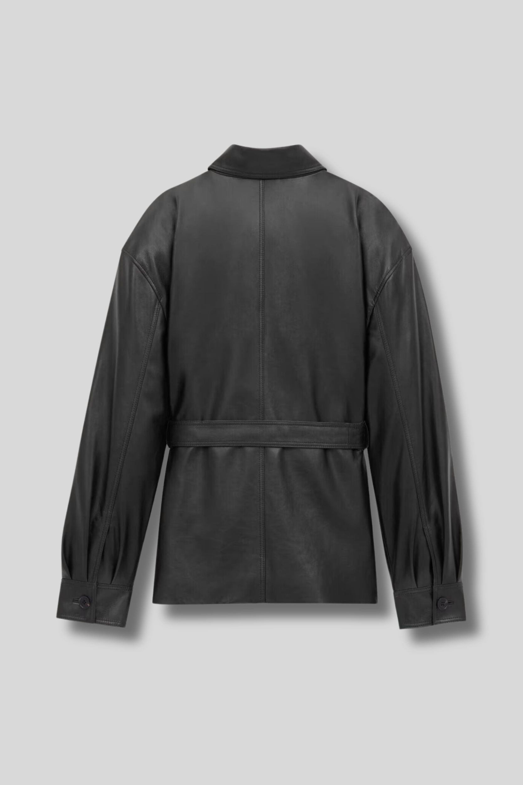 Cette veste chemise saharienne en cuir d'agneau noir est signée Saint Laurent. Celle-ci est détaillée d'un col en pointe, d'une taille ceinturée et de manches bouffantes. Cette pièce possède une fermeture boutonnée et de deux poches plaquées sur la poitrine.