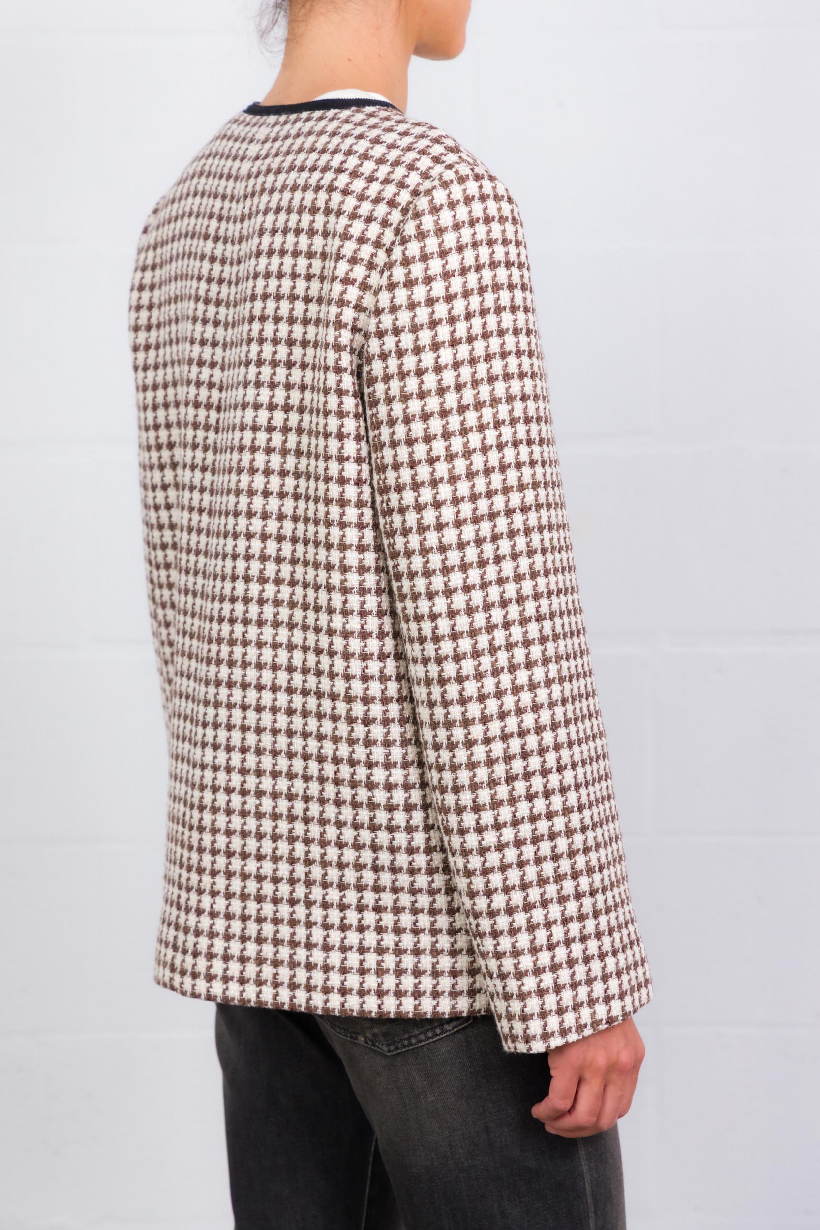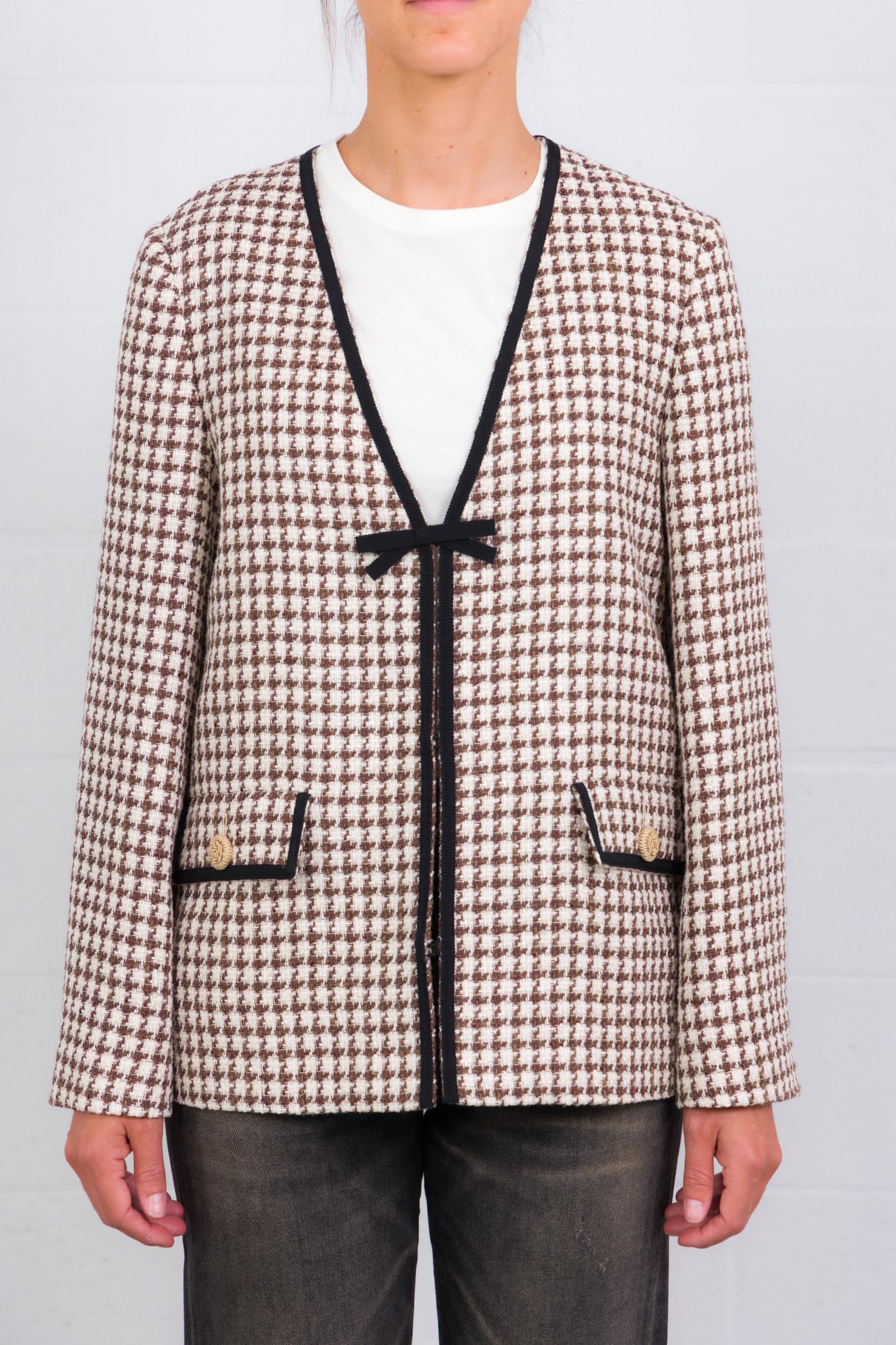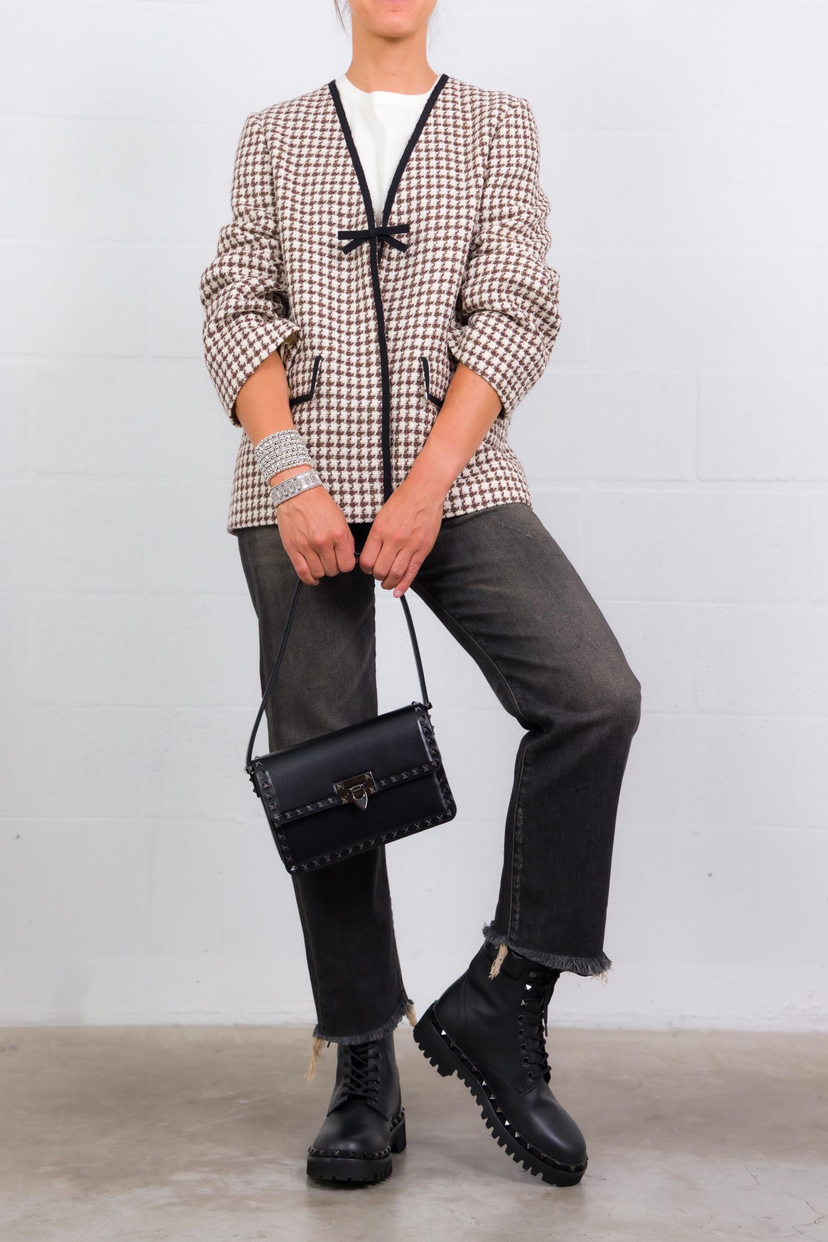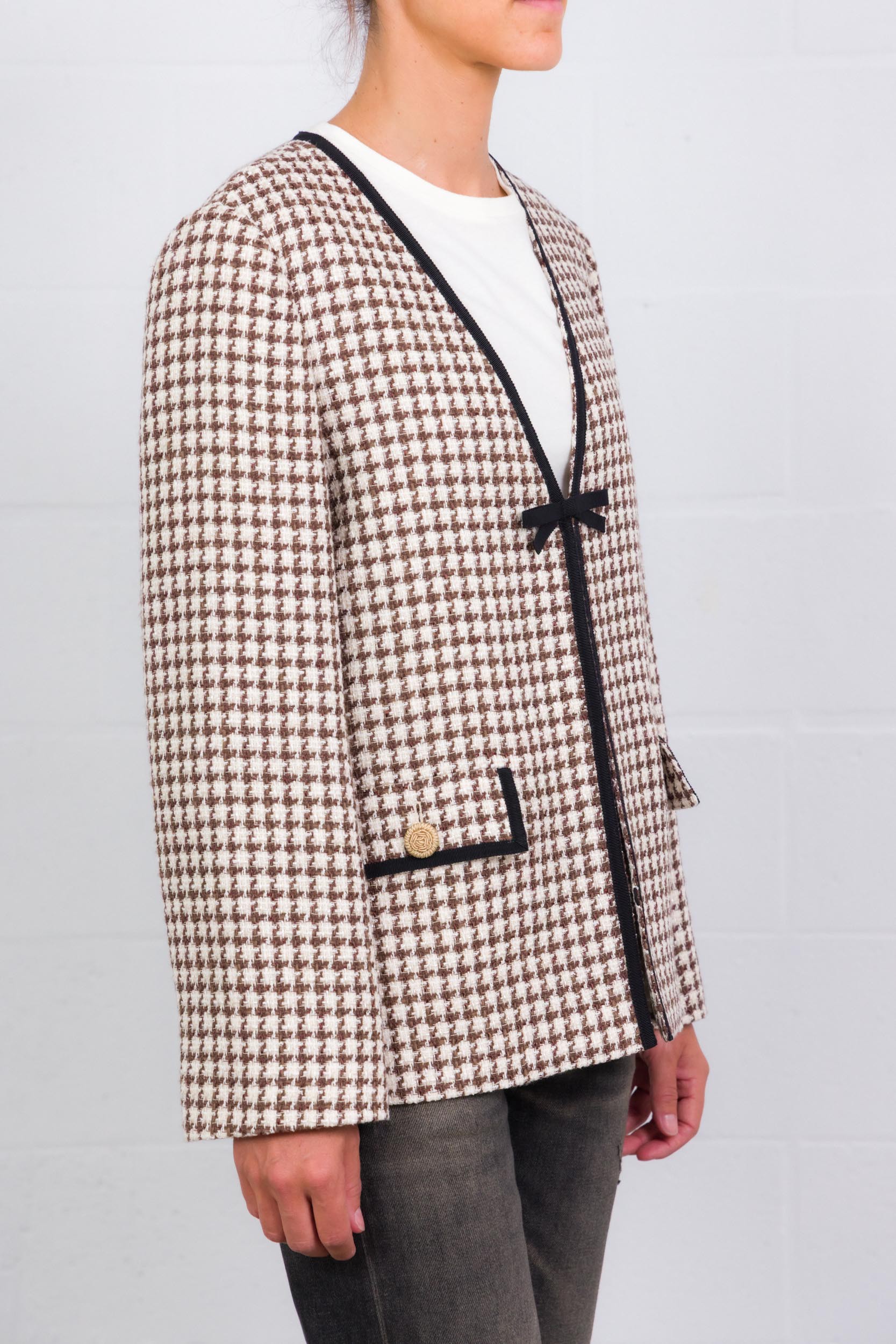 Cette veste en tweed pied-de-poule est signée Valentino Garavani. Celle-ci combine raffinement classique et modernité. Elle se ferme sur le devant par des crochets discrets recouverts et se pare d’un nœud en gros-grain, détail féminin et sophistiqué.