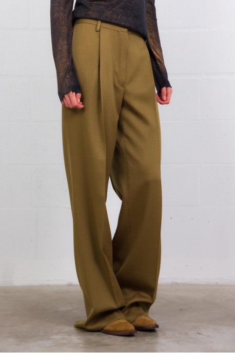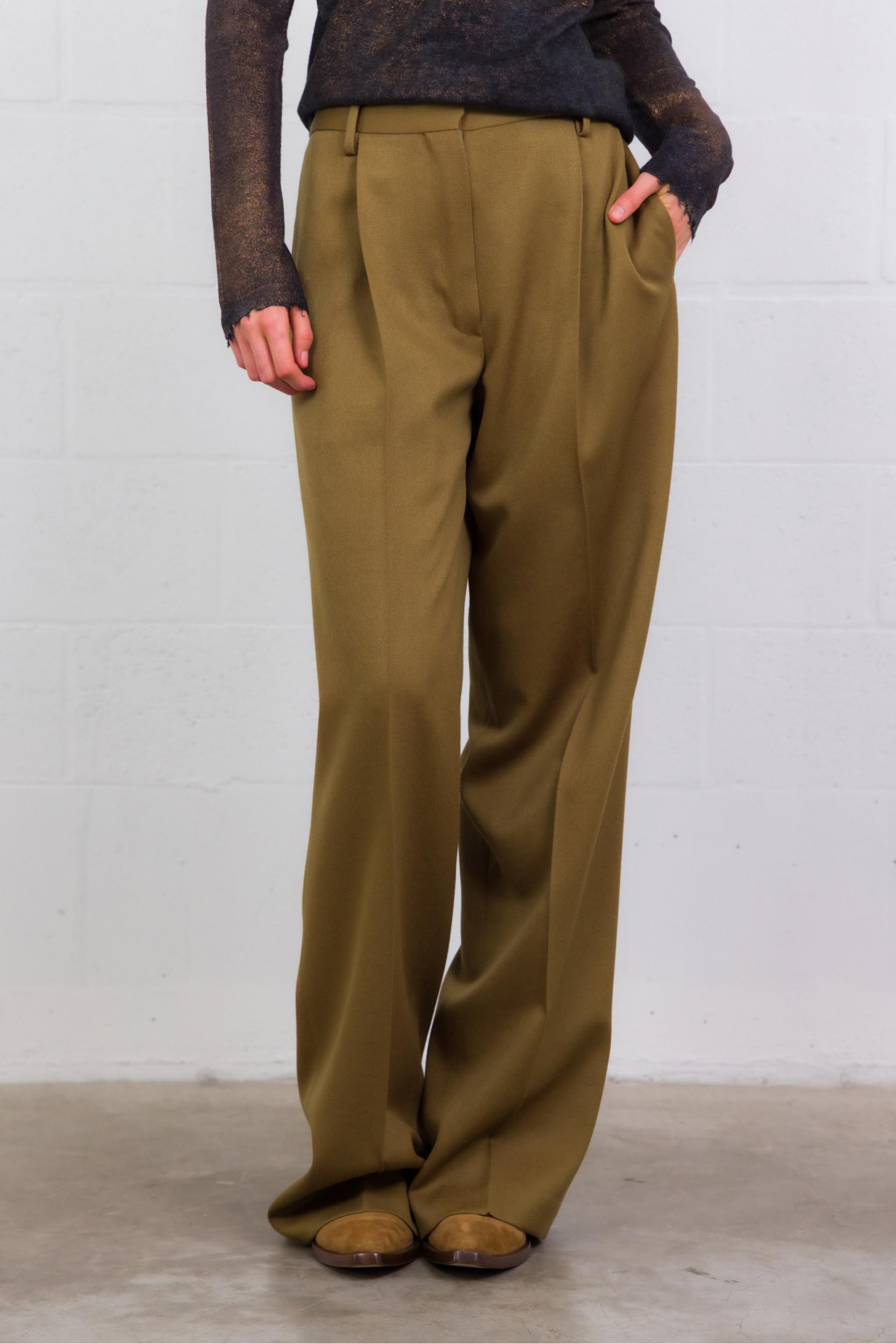 Ce pantalon signé Dries Van Noten, confectionné en 100 % laine, incarne l’élégance structurée d’un tailoring raffiné. Sa coupe droite et flatteuse, associée à des plis soignés, structure la silhouette avec fluidité. Il allie fonctionnalité et style par ses poches latérales fendues, des poches arrières passepoilées, des passants de ceinture, et une fermeture classique bouton + zip. Un essentiel du vestiaire automne-hiver, à la fois près du corps et intemporel.