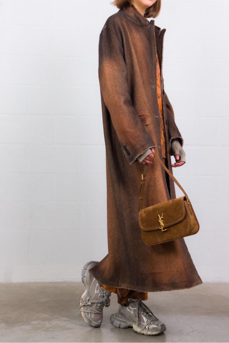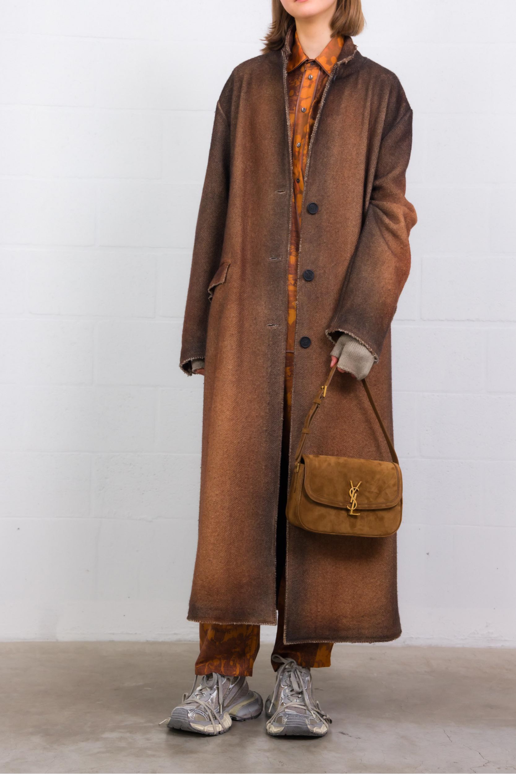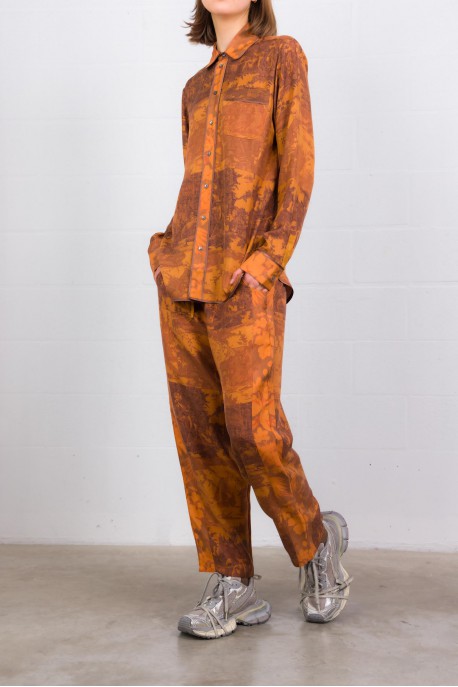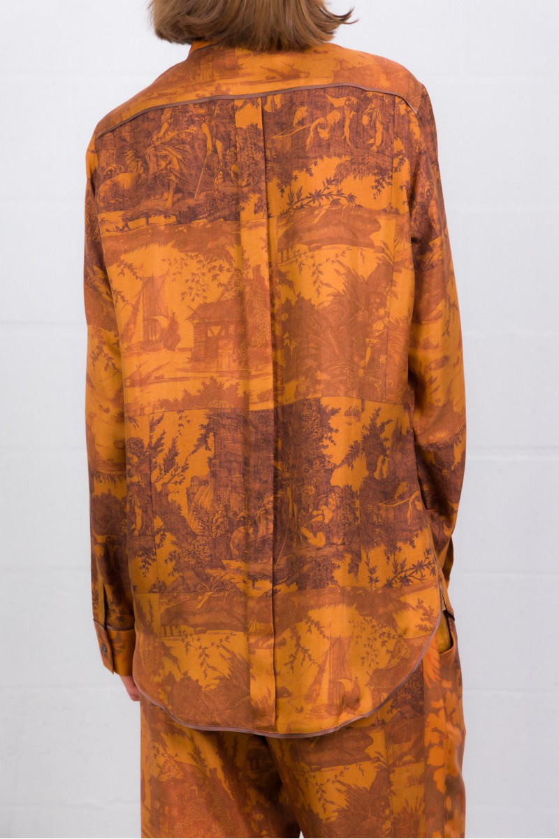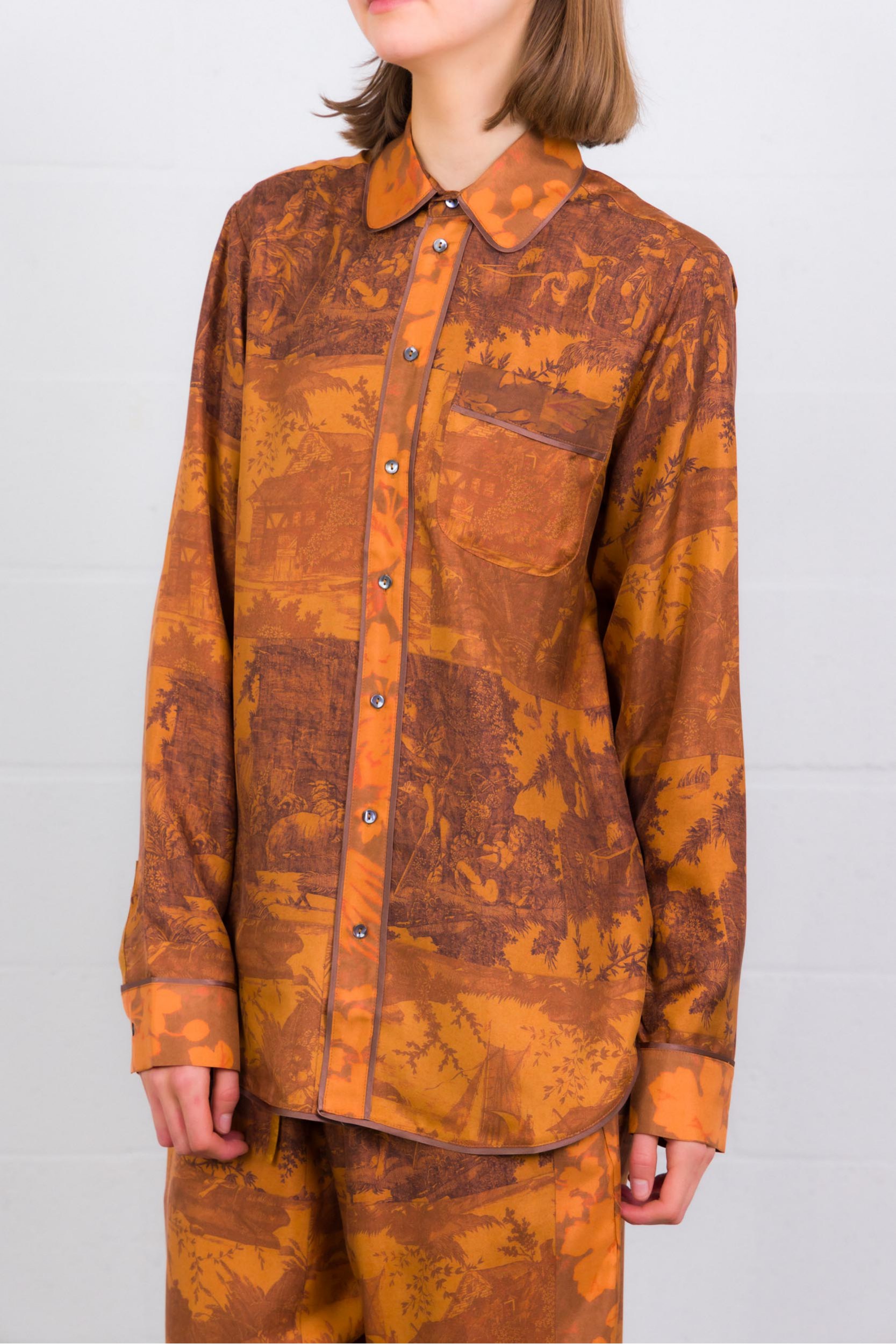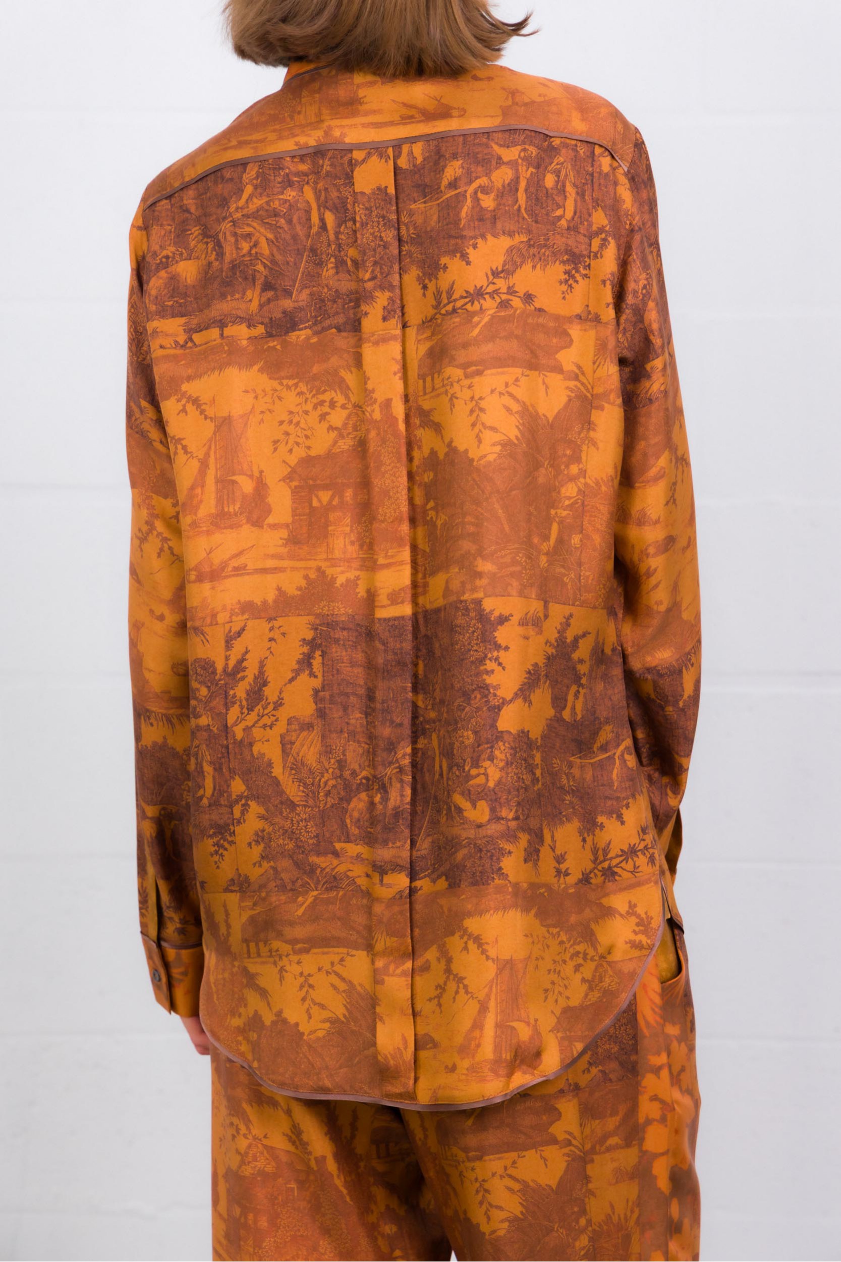 Une chemise longue manches longues en soie 100 %, au coloris orange brûlé vibrant. Son imprimé graphique combine motifs floraux et à carreaux, pour un contraste subtil mais marquant. Le col classique, les poignets boutonnés et l’ourlet légèrement arrondi lui donnent une finition soignée. Coupe droite qui tombe naturellement — elle se porte aussi bien rentrée que lâchée, idéale pour apporter chaleur et caractère à une tenue sobre.