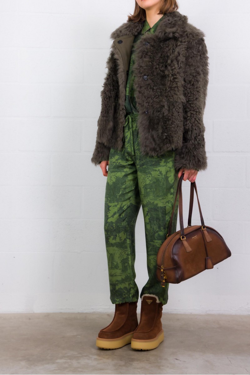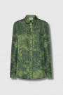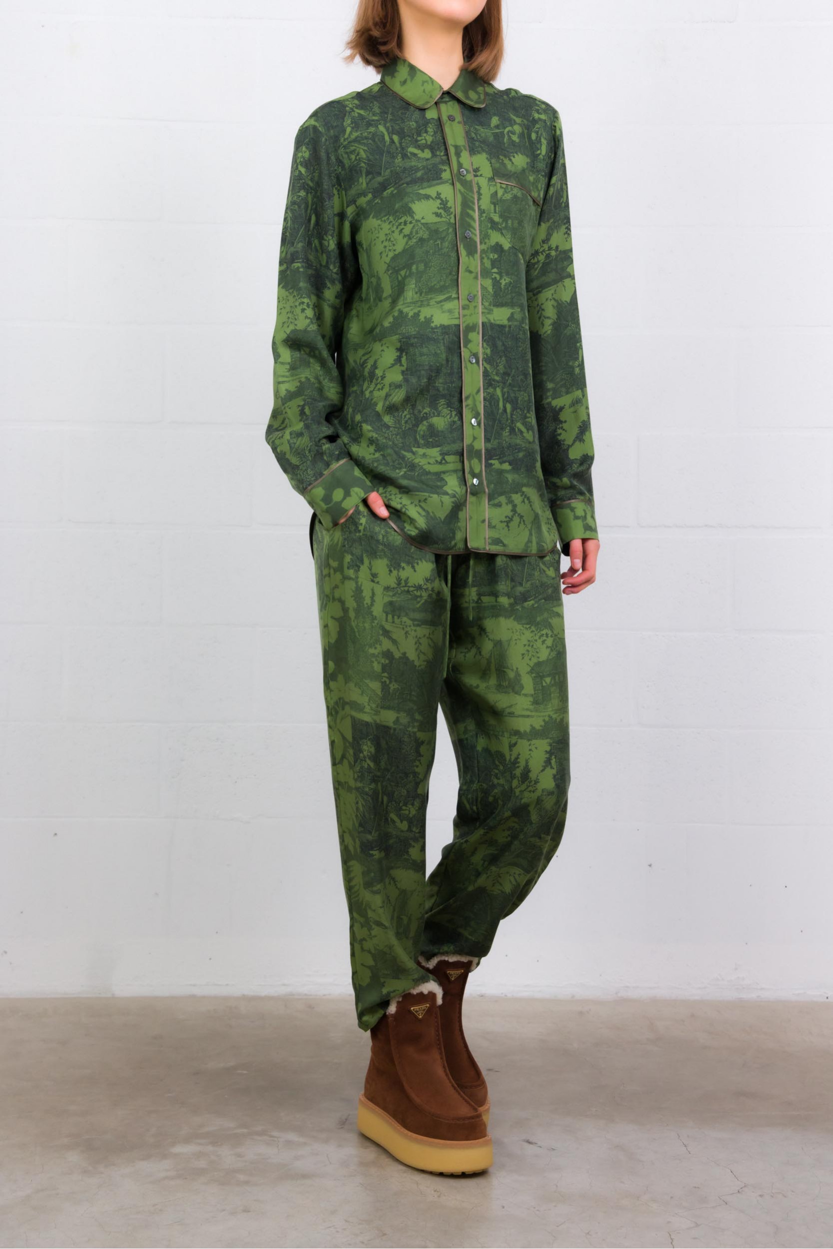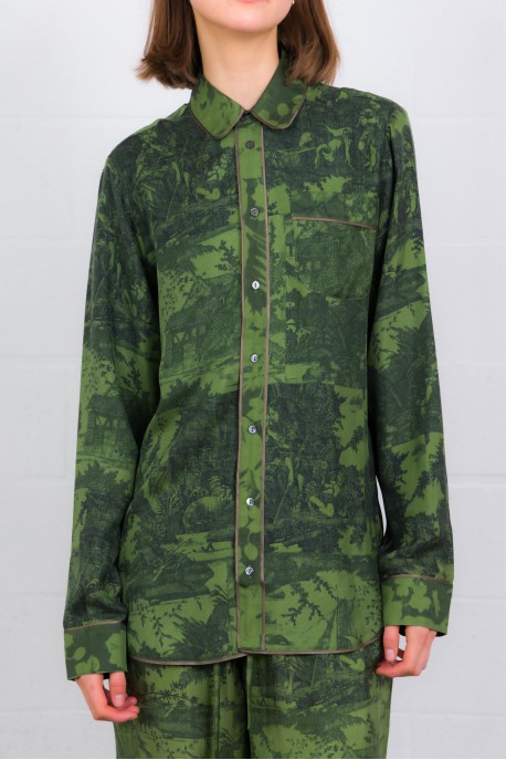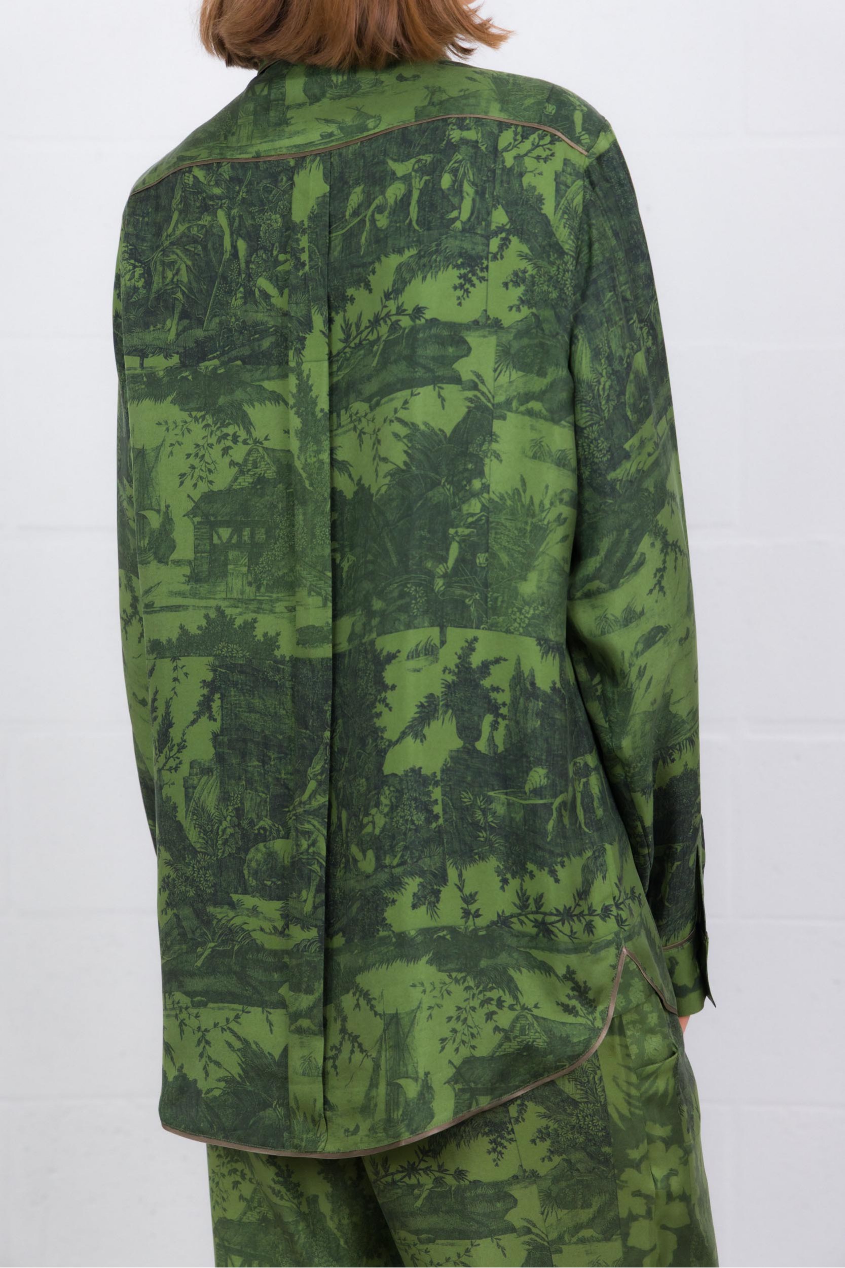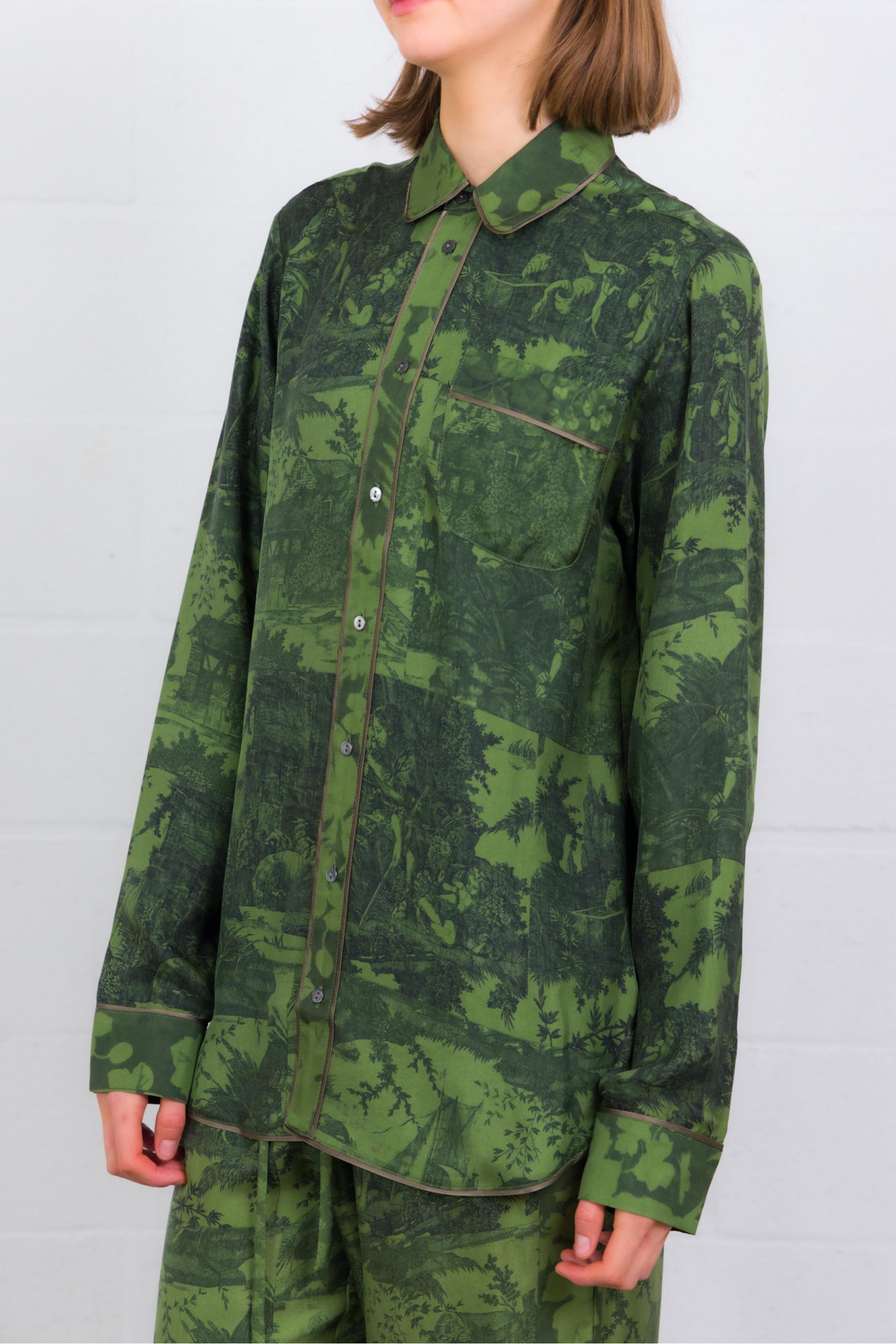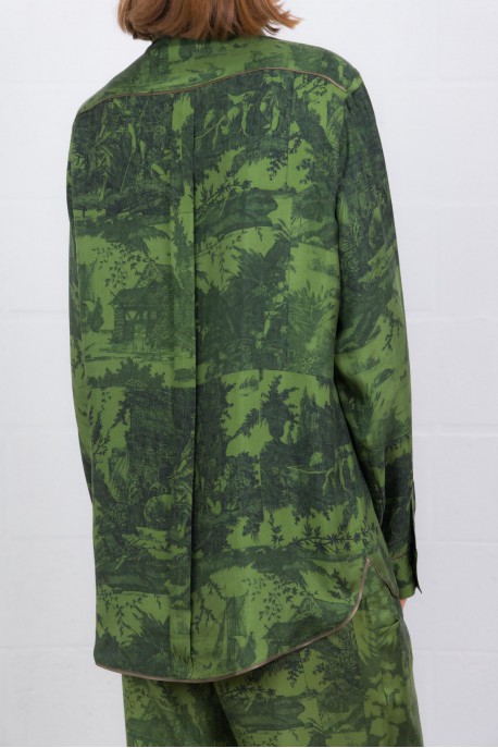 Une chemise longue manches longues en soie 100 %, au coloris vert forêt vibrant. Son imprimé graphique combine motifs floraux et à carreaux, pour un contraste subtil mais marquant. Le col classique, les poignets boutonnés et l’ourlet légèrement arrondi lui donnent une finition soignée. Coupe droite qui tombe naturellement — elle se porte aussi bien rentrée que lâchée, idéale pour apporter chaleur et caractère à une tenue sobre.