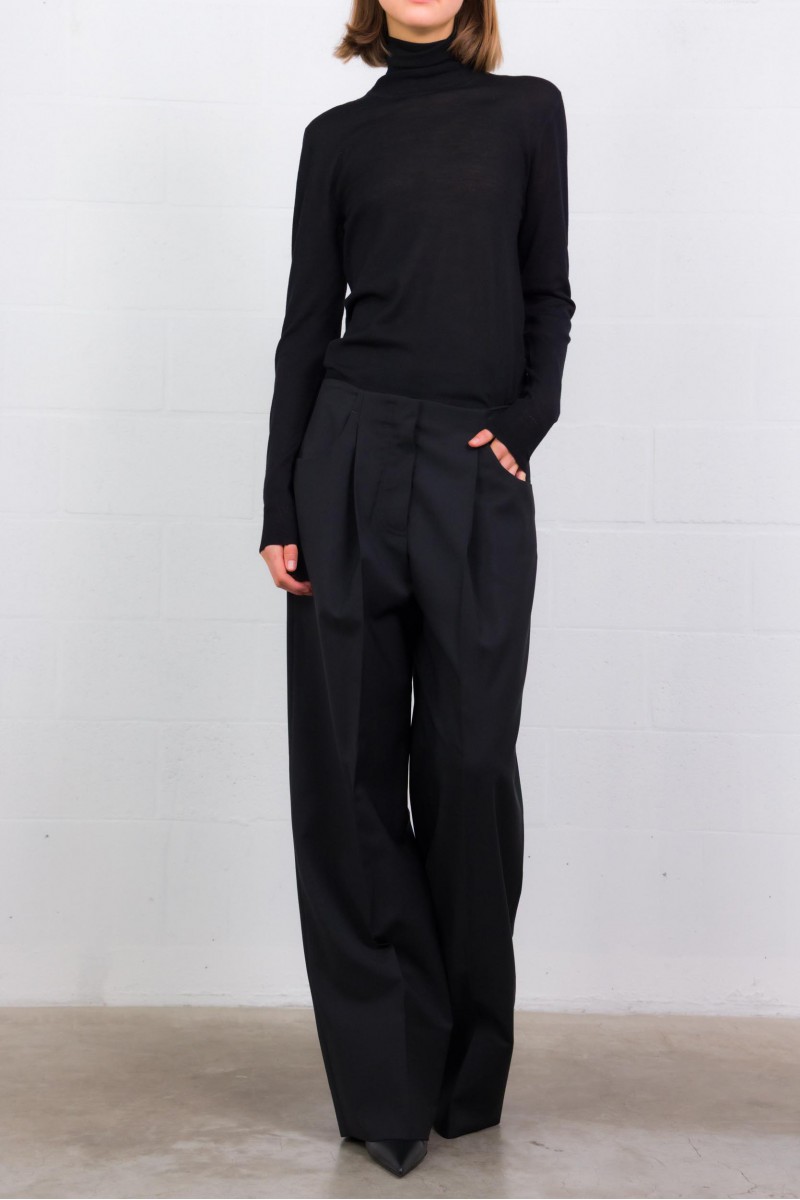 Ce pantalon Fendi incarne le raffinement italien à travers une coupe large et fluide, dans un ton noir iconique. Conçu en mélange haut de gamme de laine et mohair, il se distingue par ses plis marqués à l’avant, ses poches latérales pratiques et sa fermeture zippée dissimulée pour une finition épurée. La taille mi-haute structure la silhouette et garantit un tombé élégant. Une pièce forte, idéale pour moderniser vos looks chic ou habillés dans une nuance tendance.