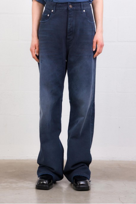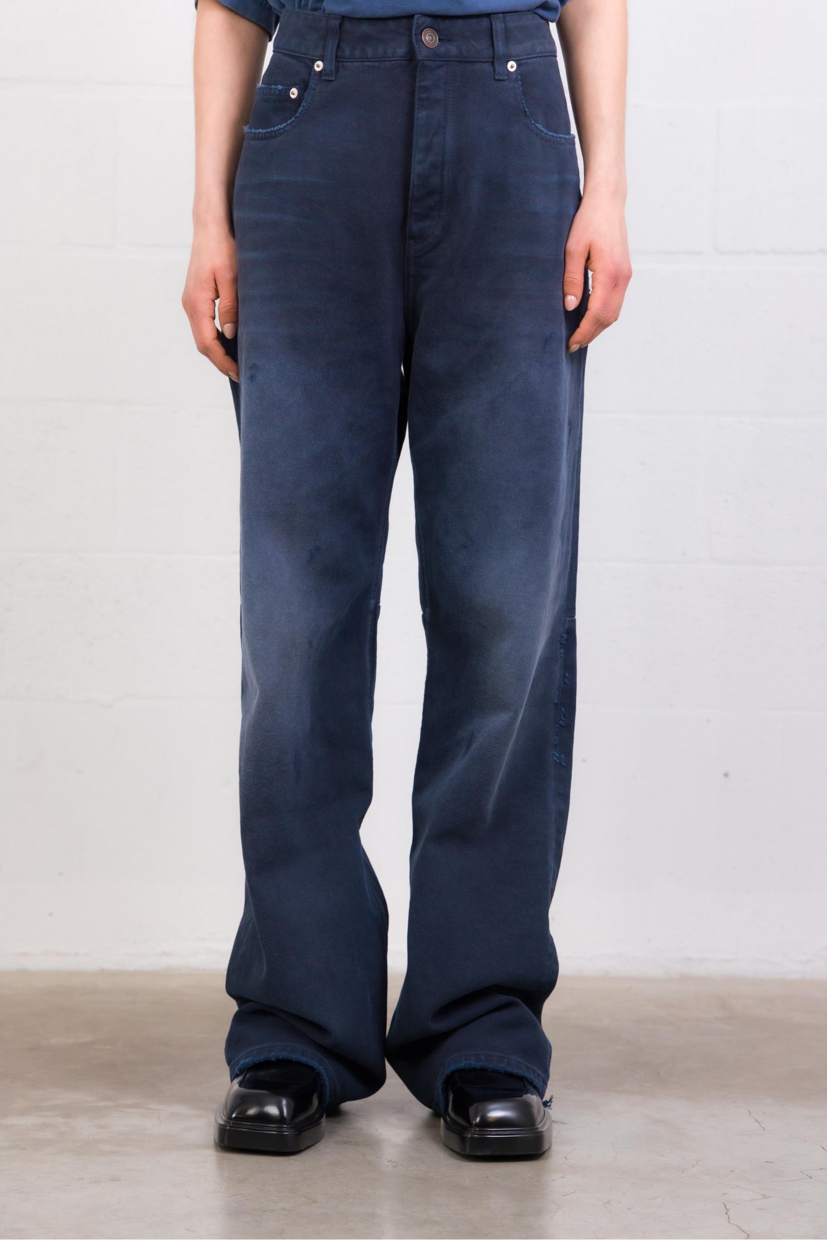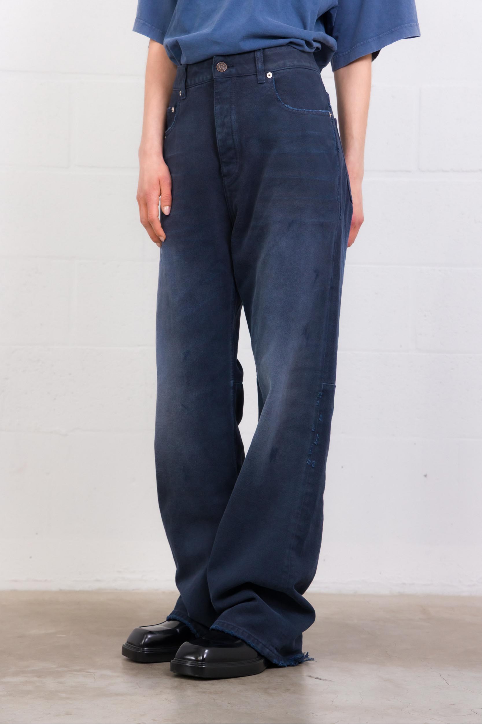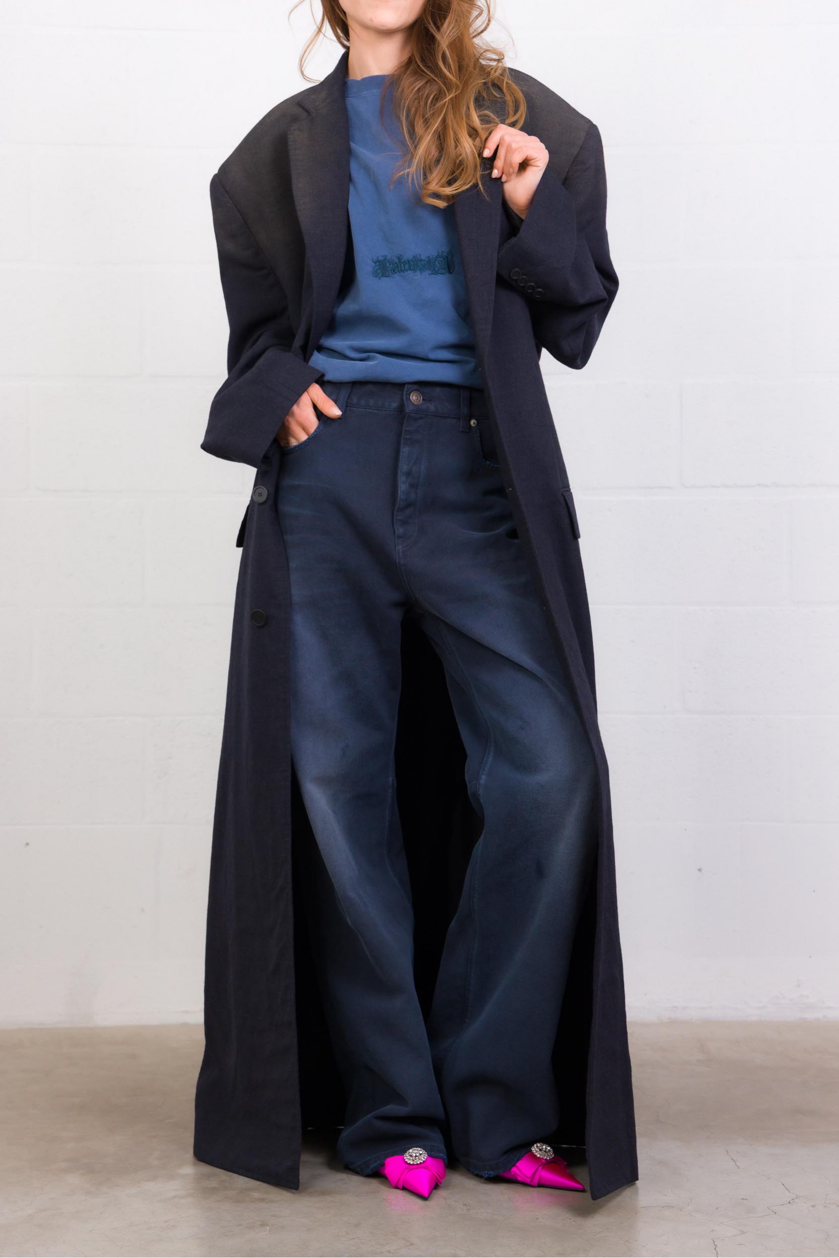 Ce jean Balenciaga se distingue par sa taille incurvée signature, qui redessine la silhouette avec une allure contemporaine et affirmée. Confectionné en denim bleu foncé avec un effet patiné subtil, il affiche une esthétique volontairement brute et moderne. Sa coupe structurée, inspirée de l’ADN tailoring de la maison, apporte du caractère tout en restant facile à associer, du look casual au plus pointu.