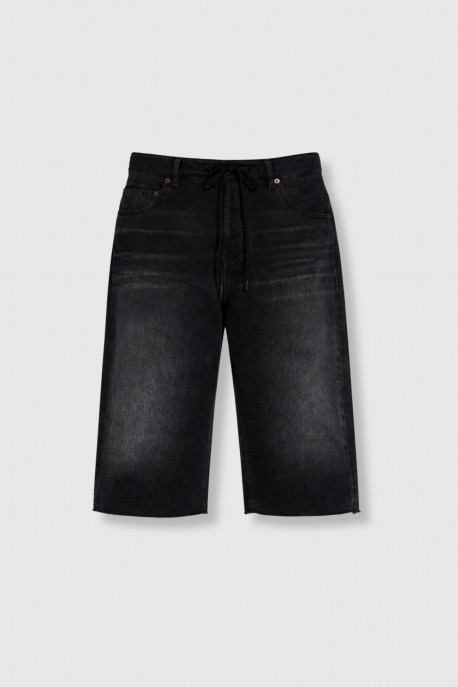 Short bermuda MM6 Maison Margiela en denim noir délavé, au design contemporain et décontracté. Confectionné dans un denim robuste, il se distingue par sa coupe droite longueur genou, sa taille ajustable par cordon et ses finitions volontairement effilochées à l’ourlet. L’effet usé apporte une touche brute et moderne, tandis que sa silhouette structurée permet de l’associer facilement à un t-shirt, une chemise ou une veste pour un look urbain maîtrisé.