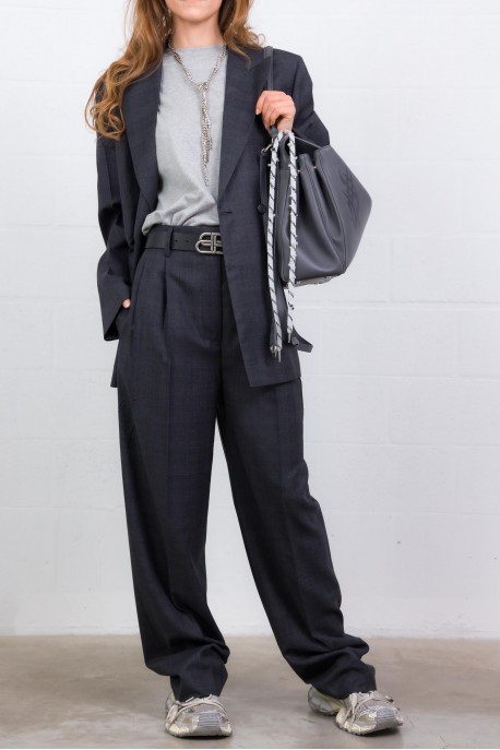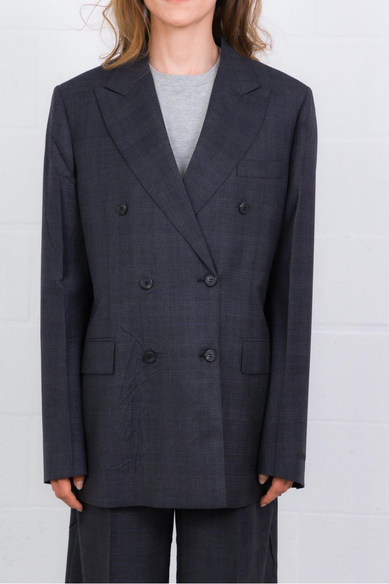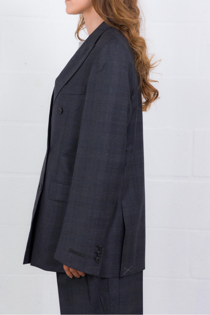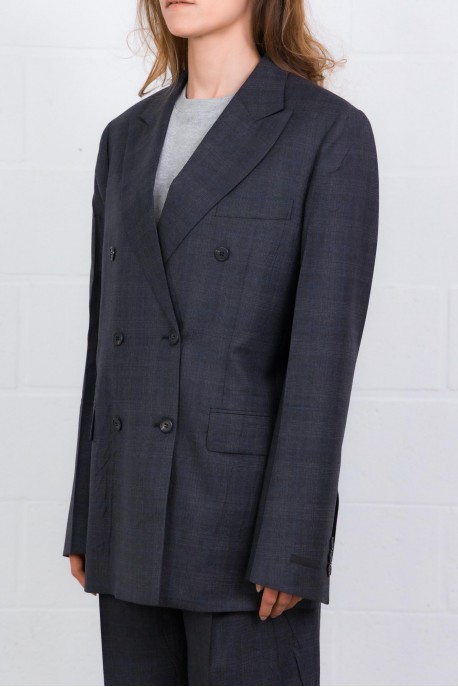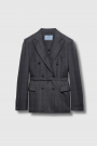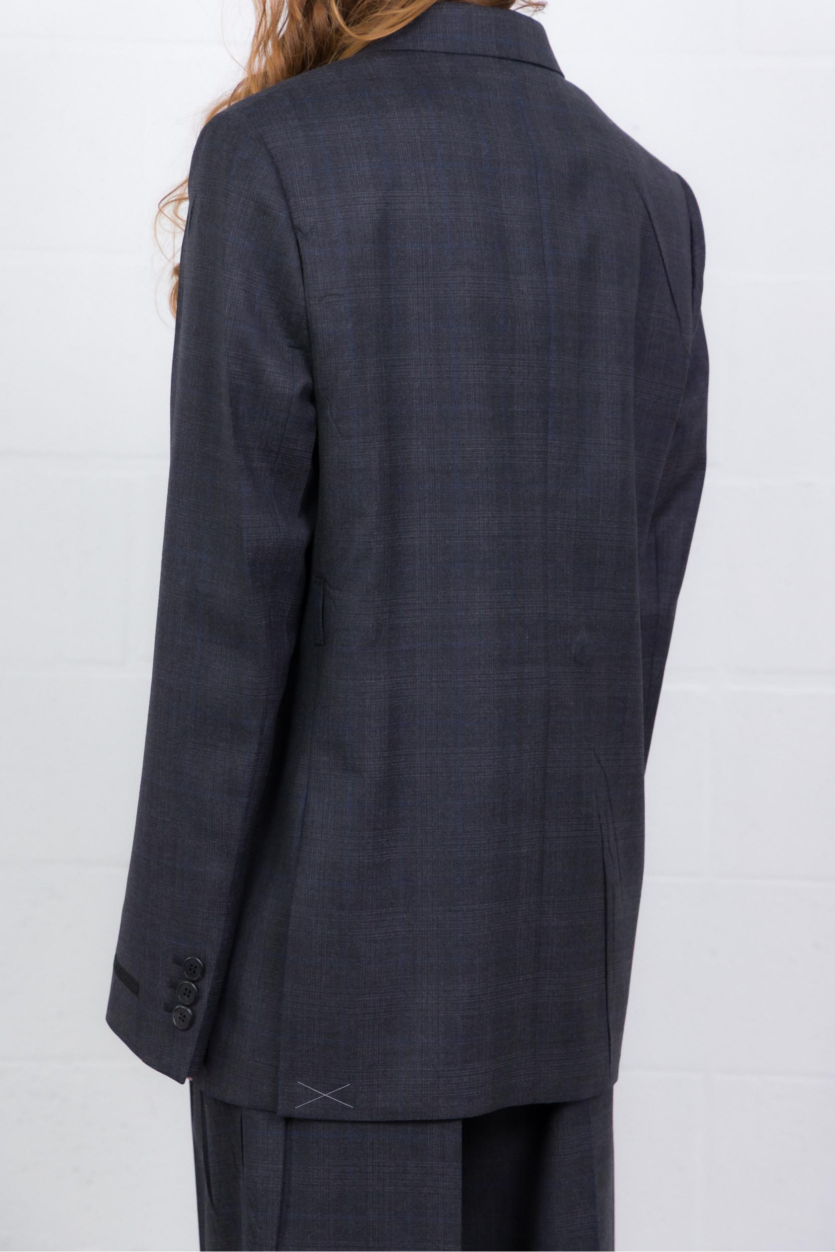 Ce blazer croisé signé Prada revisite le tailoring classique avec une approche contemporaine. Confectionné en laine à carreaux dans des nuances de gris, beige et touches subtiles de bleu, il présente une coupe structurée soulignée par un double boutonnage et des épaules nettes qui affirment la silhouette. Le motif apporte profondeur et caractère, tandis que les revers larges renforcent son allure sophistiquée. Une pièce forte, idéale pour un vestiaire tailoring moderne et affirmé.