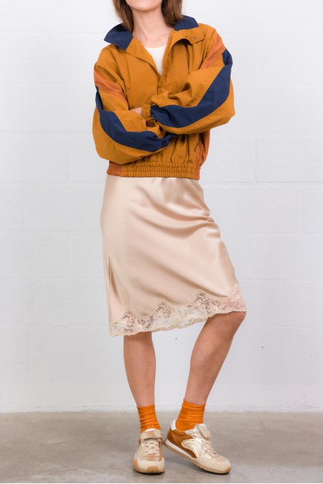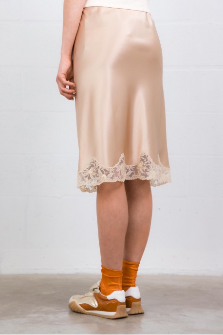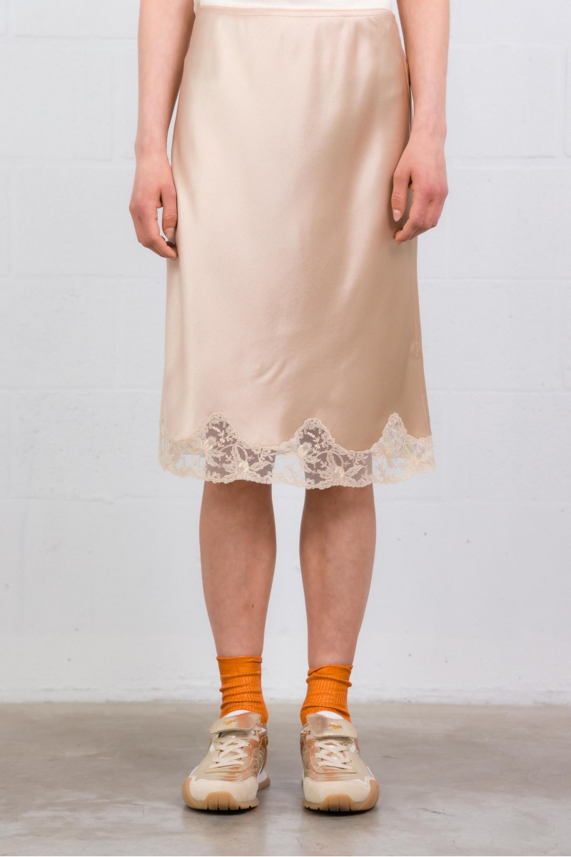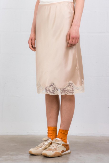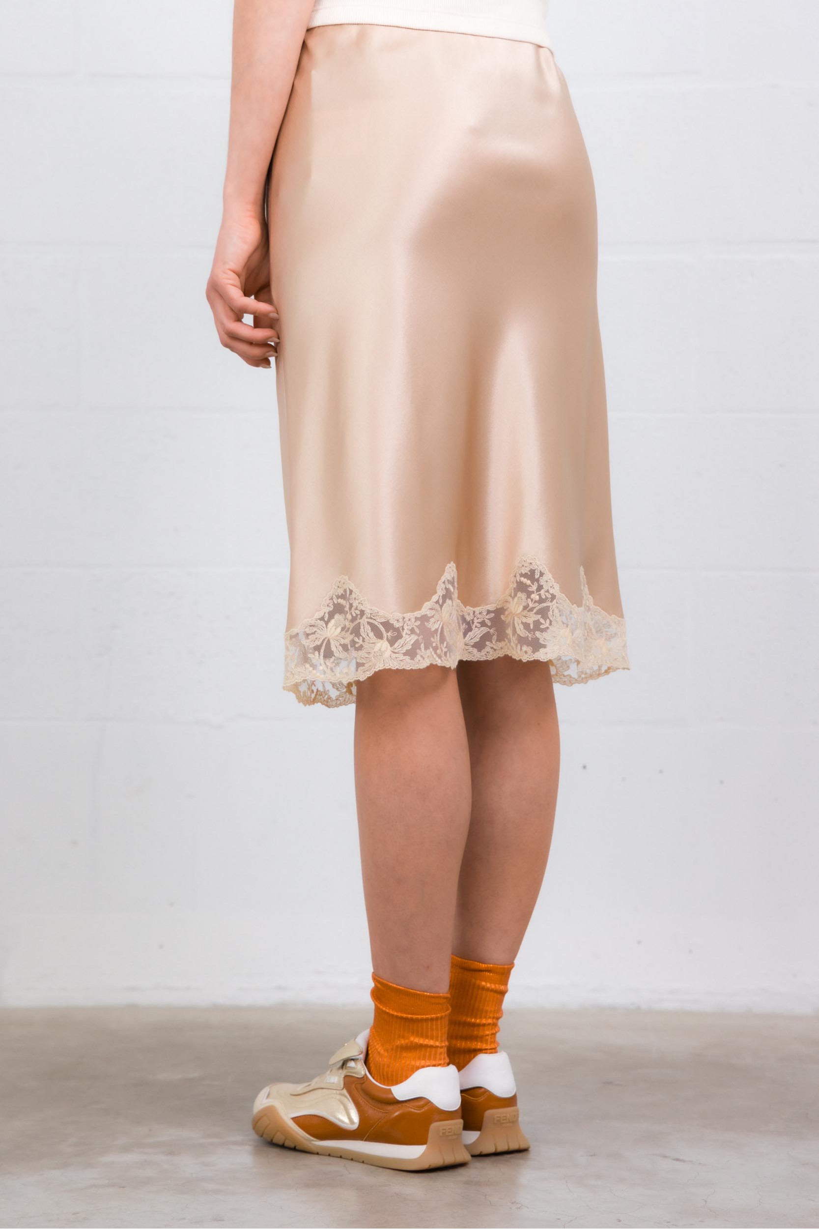 Élégante et sensuelle, cette jupe signée Saint Laurent sublime la silhouette avec son satin de soie fluide et lumineux. Sa coupe longueur genoux épouse le mouvement avec légèreté, tandis que les finitions en dentelle apportent une touche délicate et féminine.