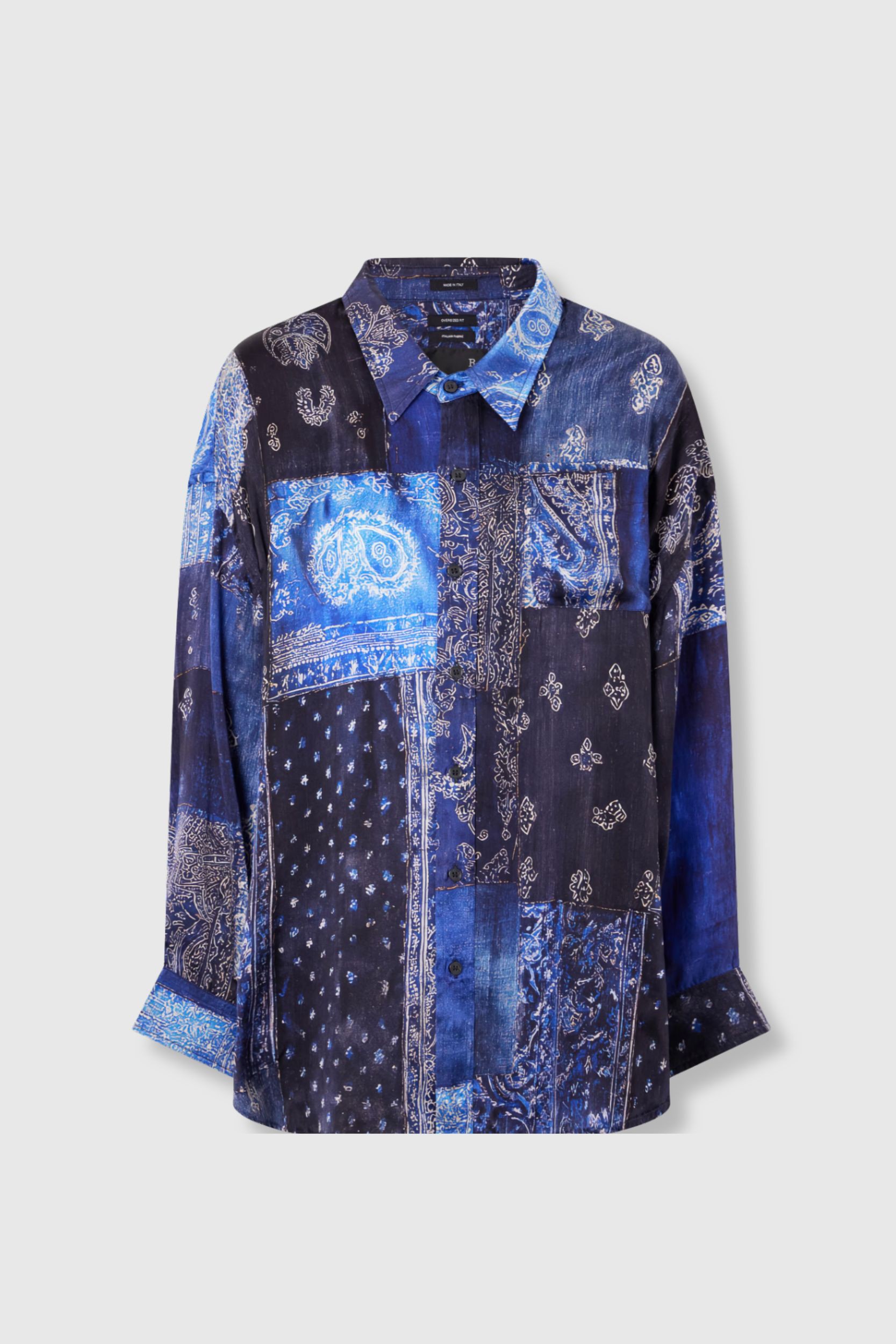 Cette chemise en soie signée R13 revisite l’esprit bandana dans une version luxueuse et contemporaine. Confectionnée en soie fluide, elle se distingue par son patchwork de motifs bleus aux nuances profondes, mêlant imprimés paisley et effets délavés.