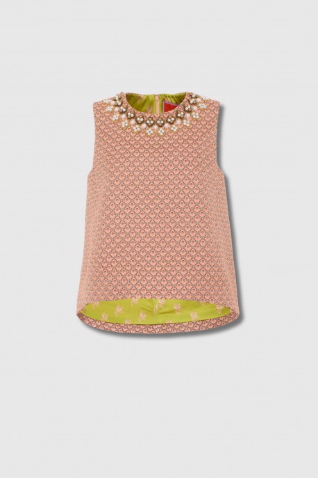 Son imprimé graphique dans des tons de rose et de beige apporte une identité visuelle forte, tandis que le col richement orné de perles et de strass attire le regard et illumine le visage. La coupe droite, légèrement évasée, assure une allure fluide et facile à porter.