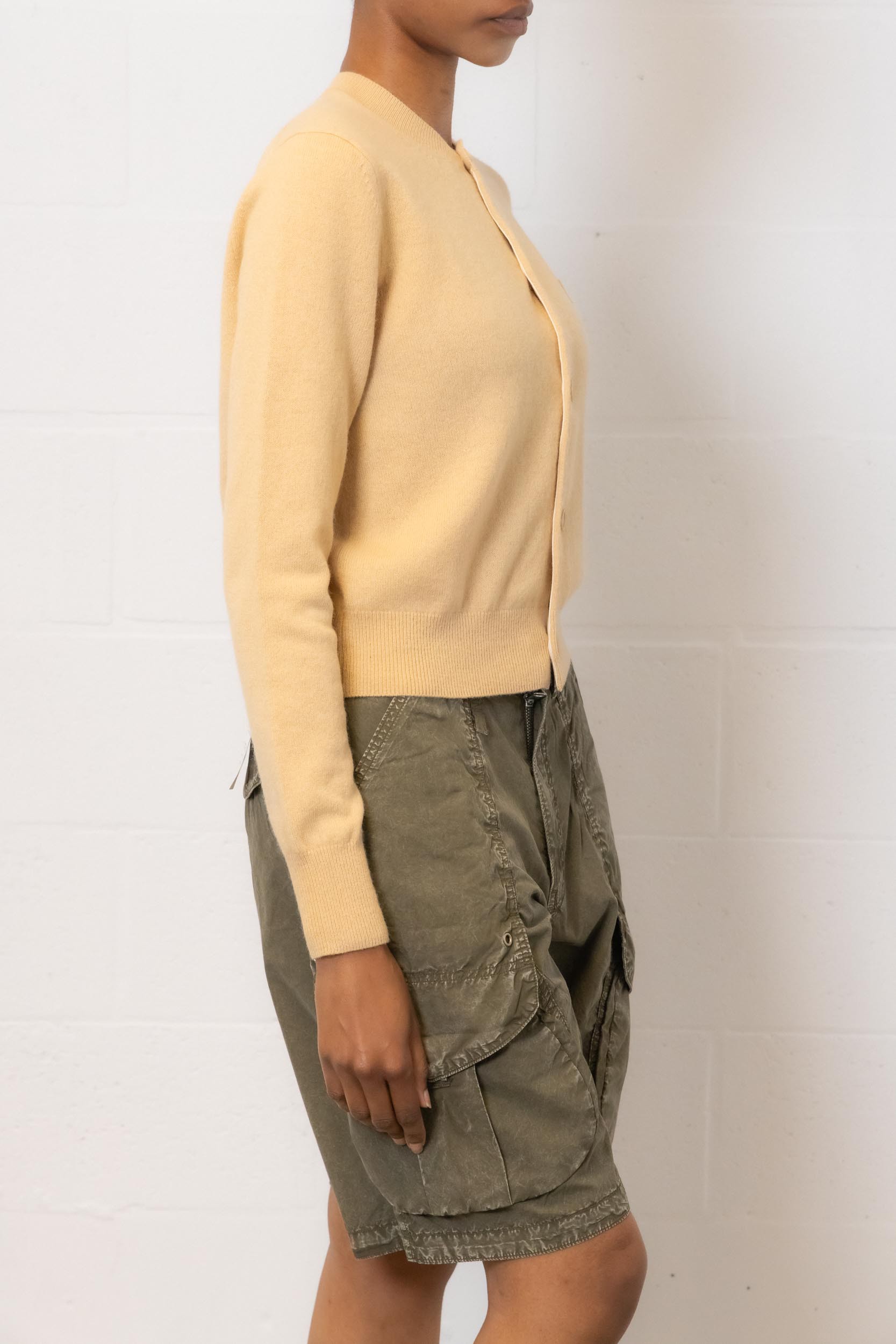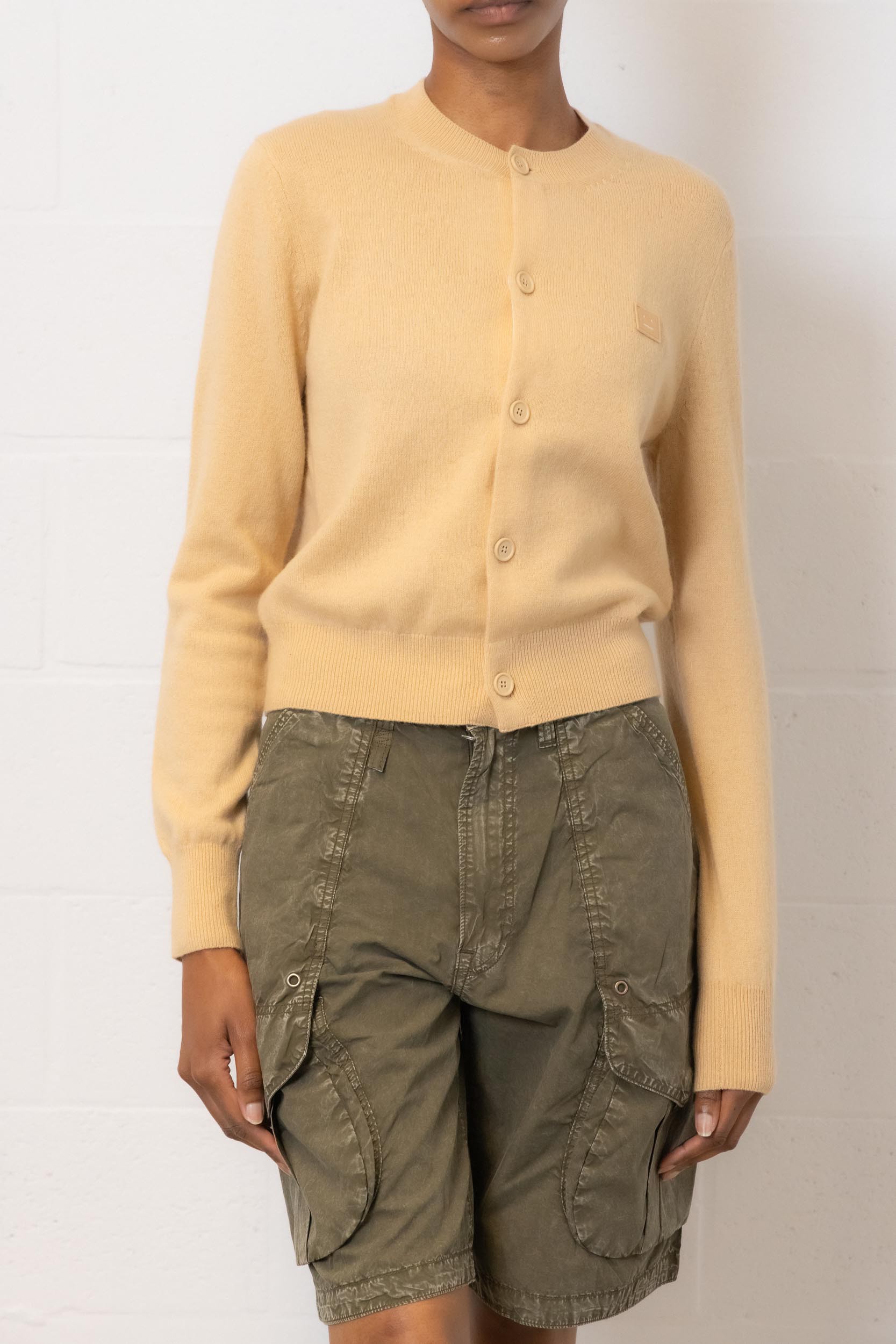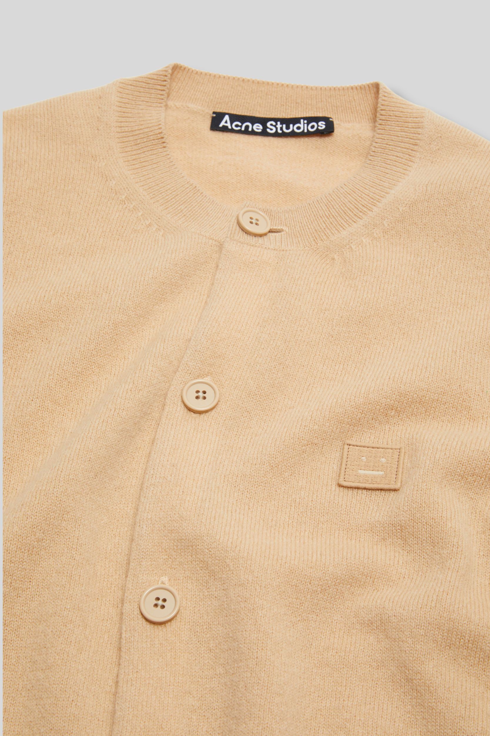 Ce cardigan beige "Biscuit" en laine légère, signé Acne Studios, est doté d'un col ras-du-cou et orné d'un logo Face ton sur ton. Sa coupe unisexe est ajustée et sa longueur tombe juste sous la taille.