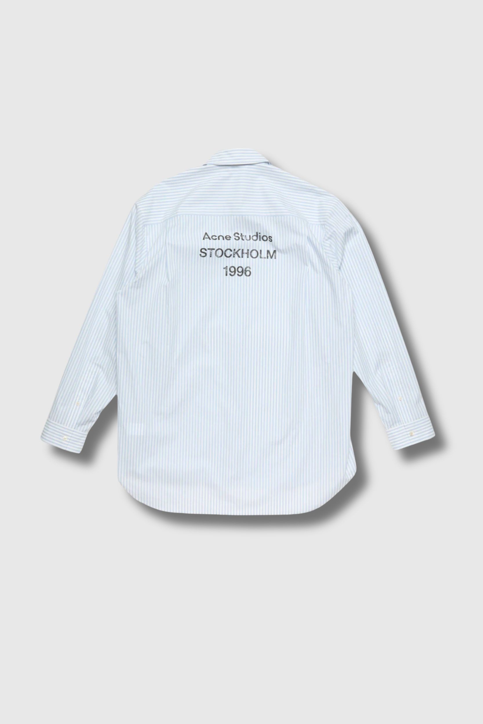 Cette chemise rayée en coton bleu ciel et blanc est signée Acne Studios. Celle-ci présente une fermeture à boutons et est détaillée du logo Acne Studios imprimé au dos. Cette pièce unisexe possède une coupe ample et une longueur sous la hanche.